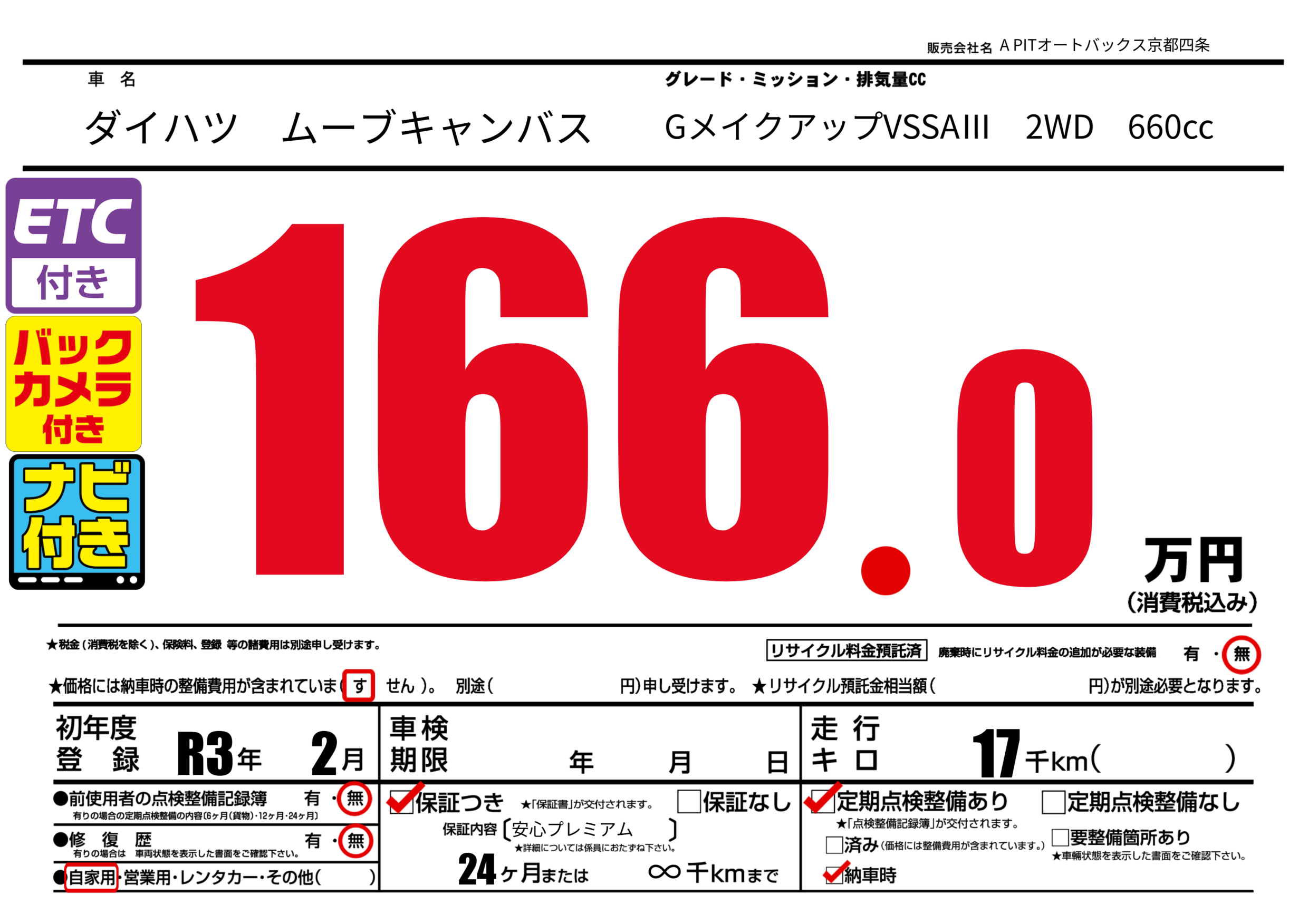 保証なし 保証内容(安心プレミアム) 24ヶ月または(∞)千kmまで |