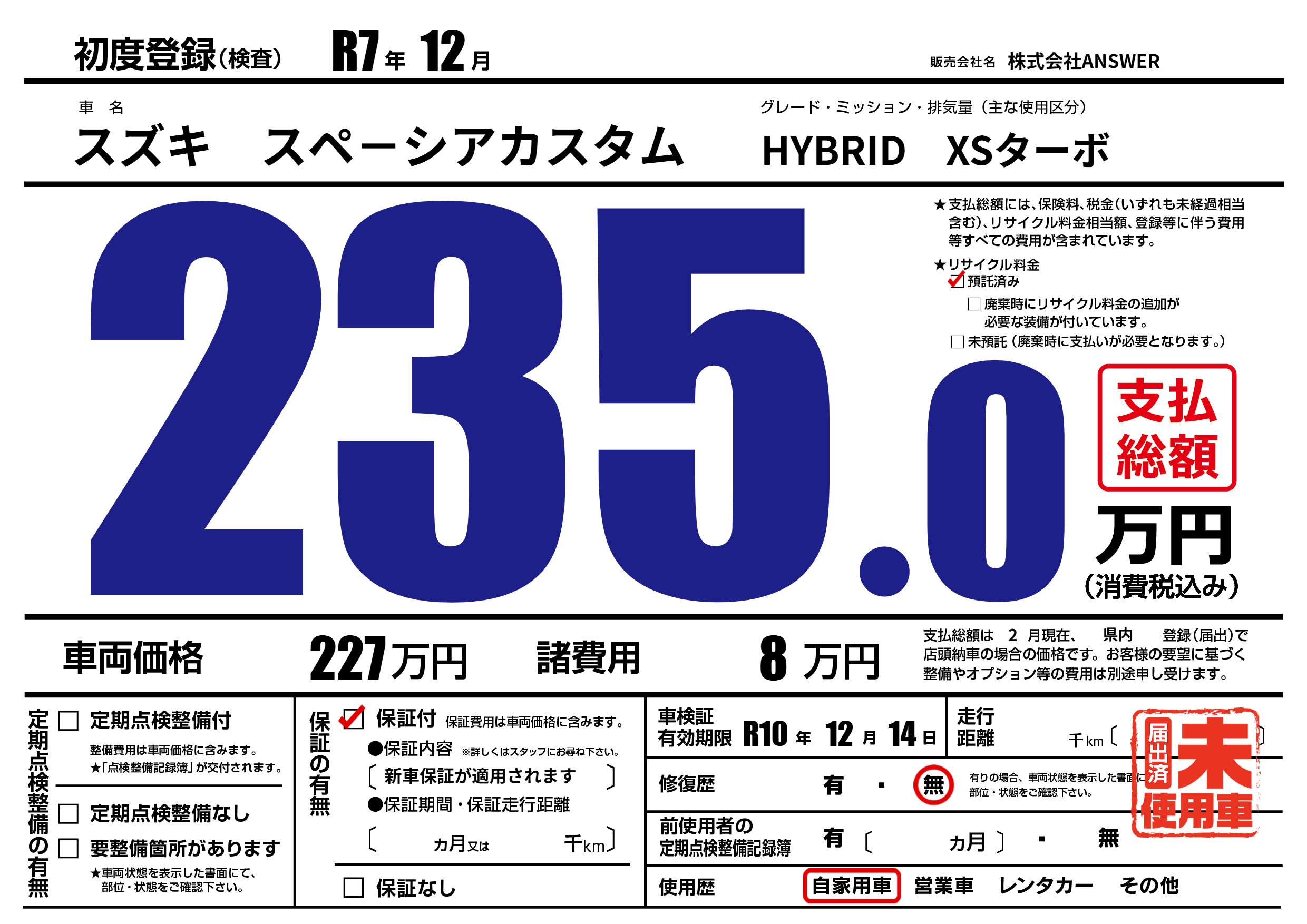 保証付き 保証内容(新車保証が適用されます) ---ヶ月または()千kmまで |