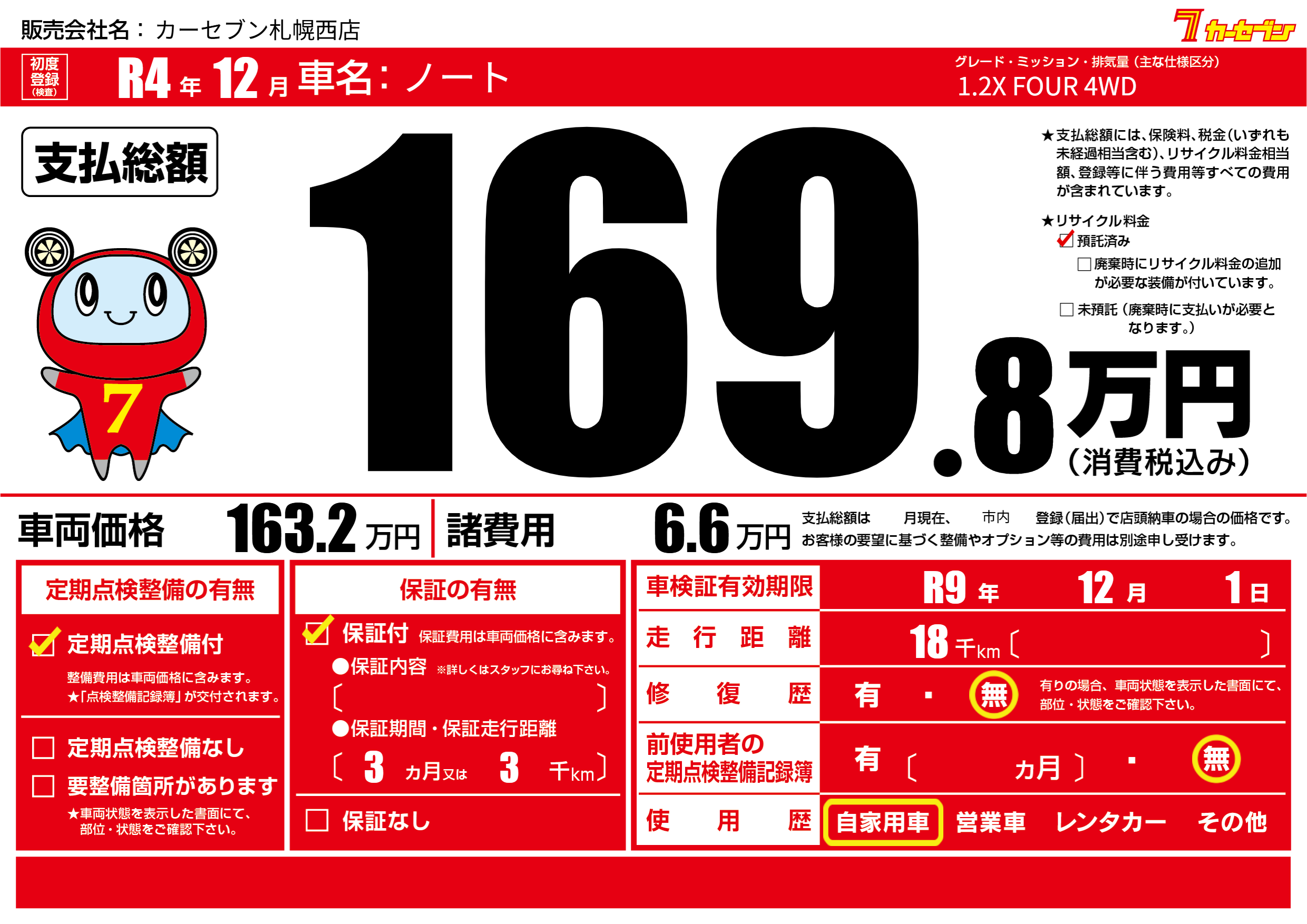 | 走行キロ | 1.8万km | 初年度登録 | R4年12月 |
