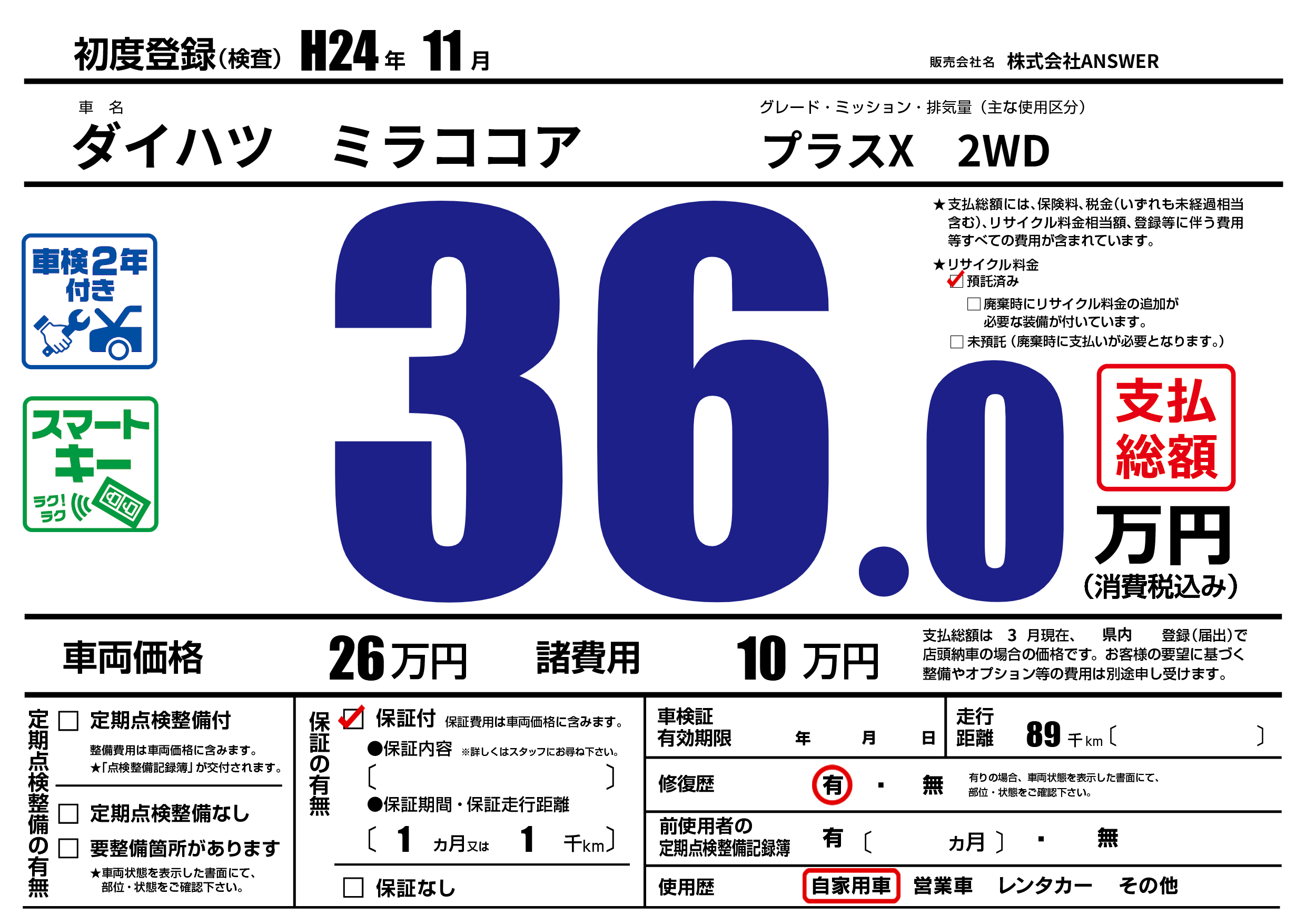 | 走行キロ | 8.9万km | 初年度登録 | H24年11月 |