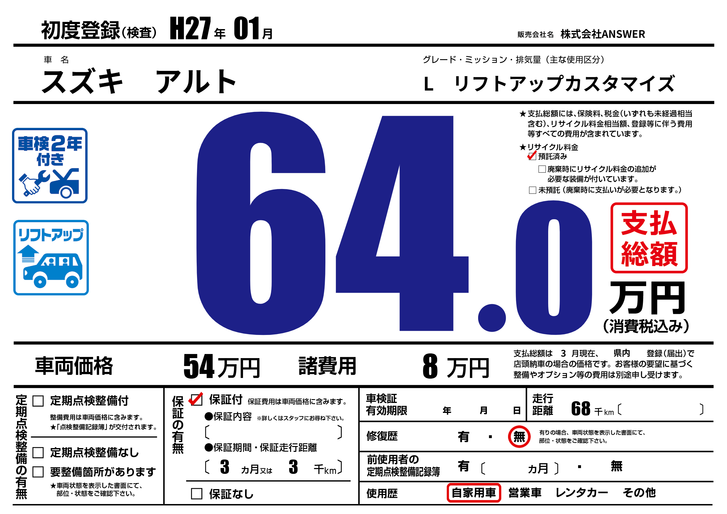 保証付き 保証内容(---) 3ヶ月または(3)千kmまで |