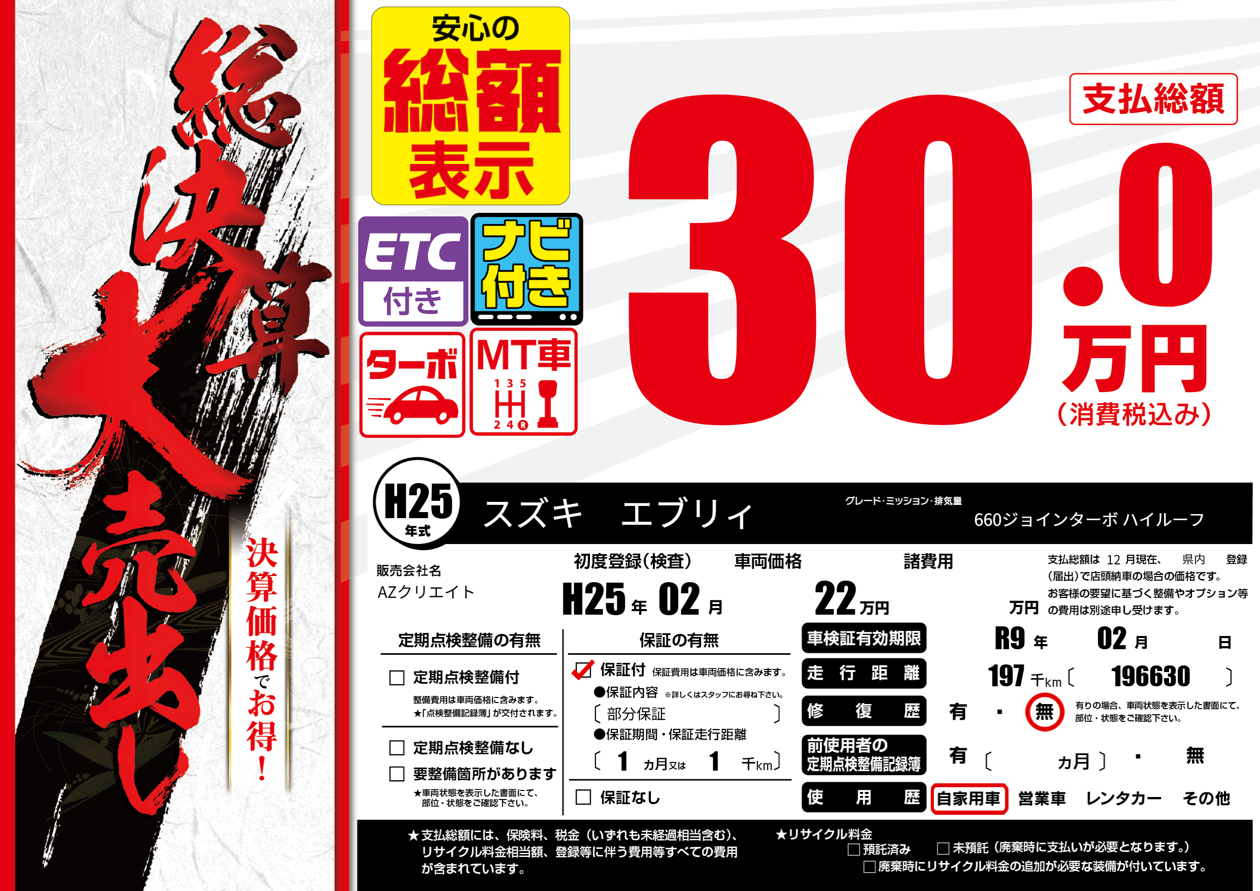 | 車名 | スズキ エブリィ | グレード ミッション 排気量 |