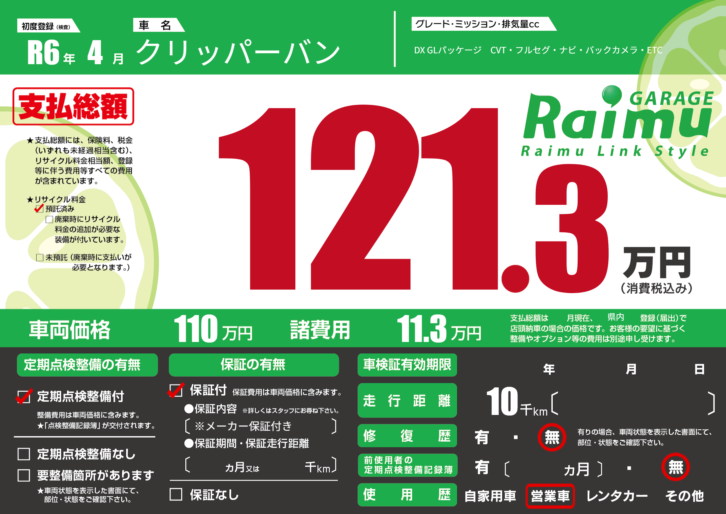保証付き 保証内容(※メーカー保証付き) ヶ月または千km |