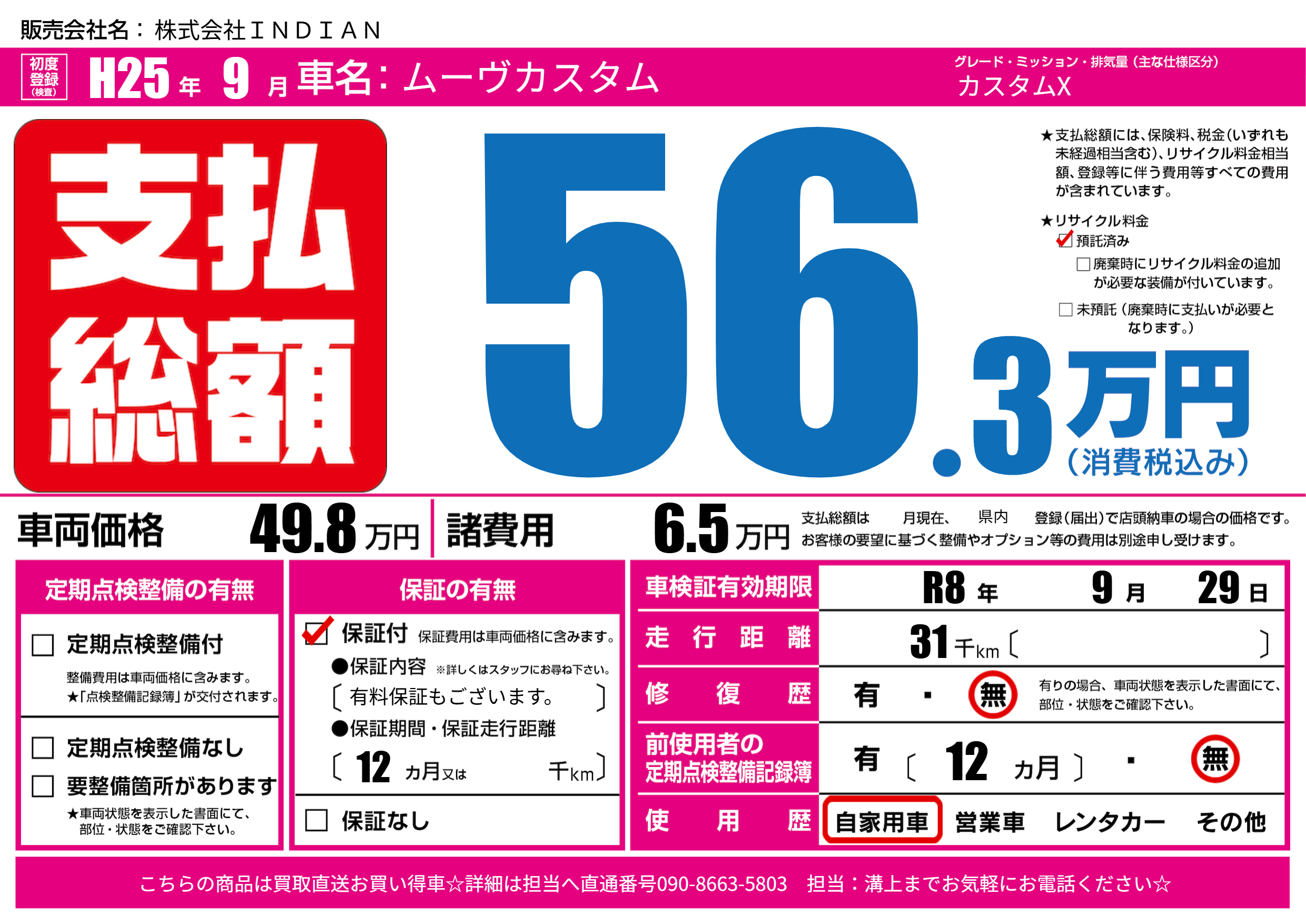 | 車検制限 | R8年 9月 29日 | ||