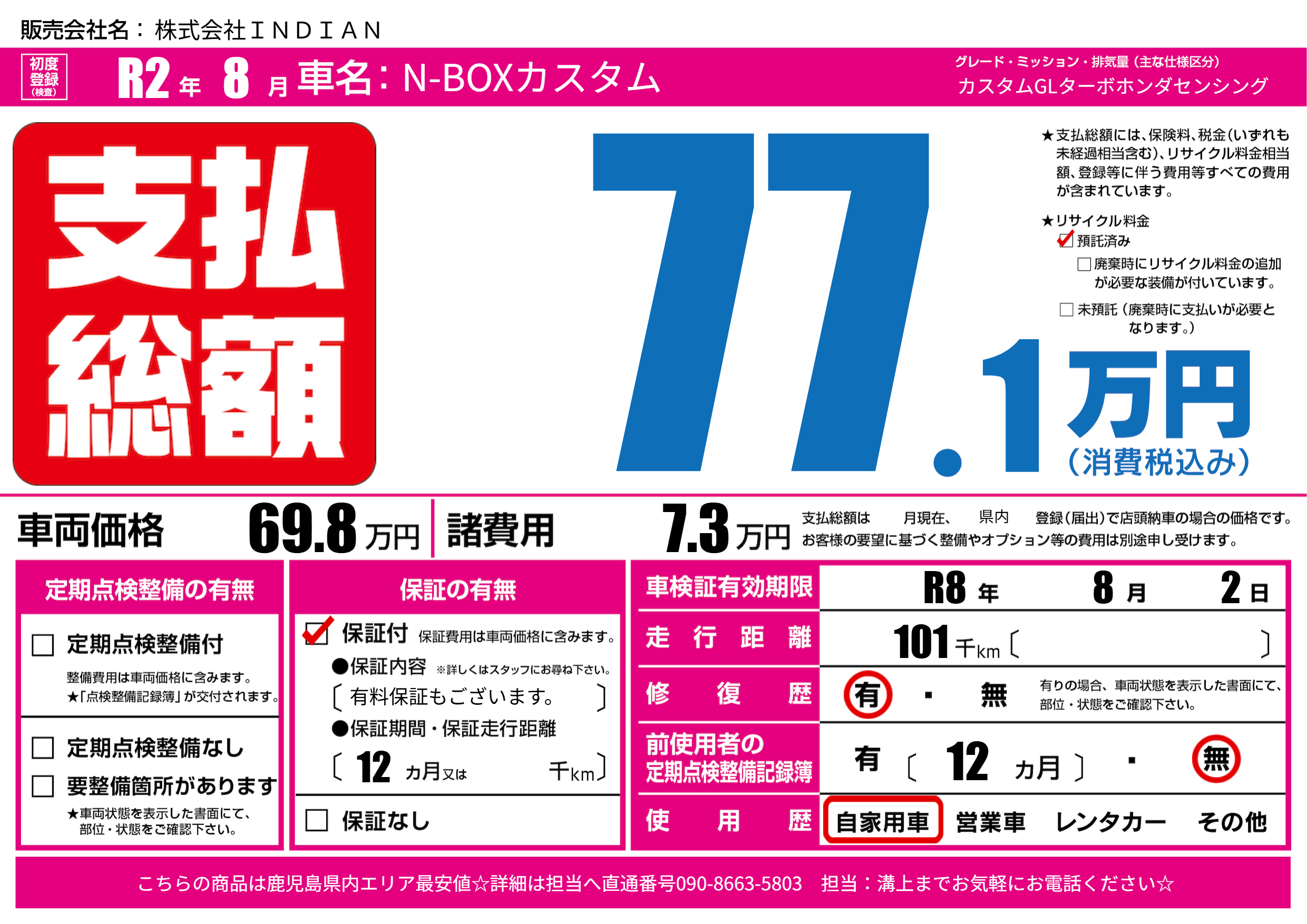 | 車検制限 | R8年 8月 2日 | ||