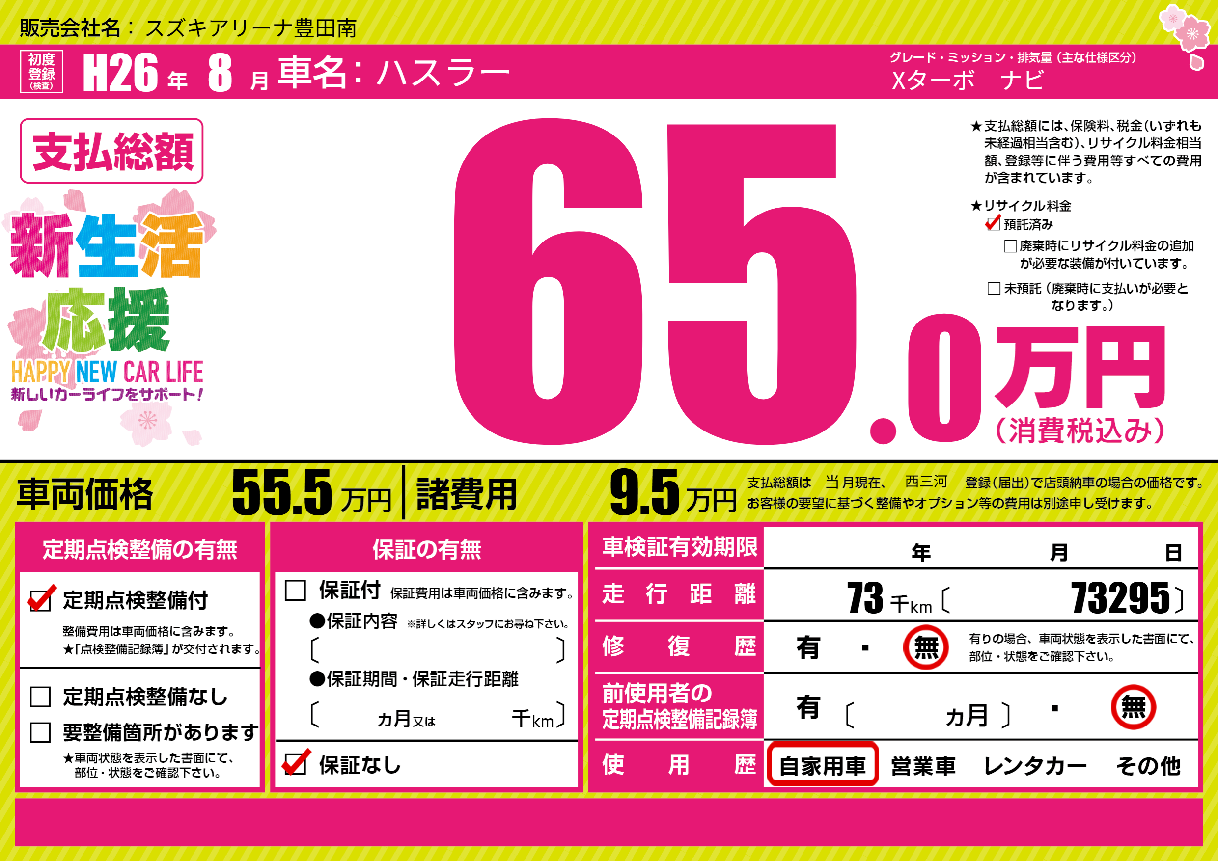 | 走行キロ | 7.3万km | 初年度登録 | H26年8月 |