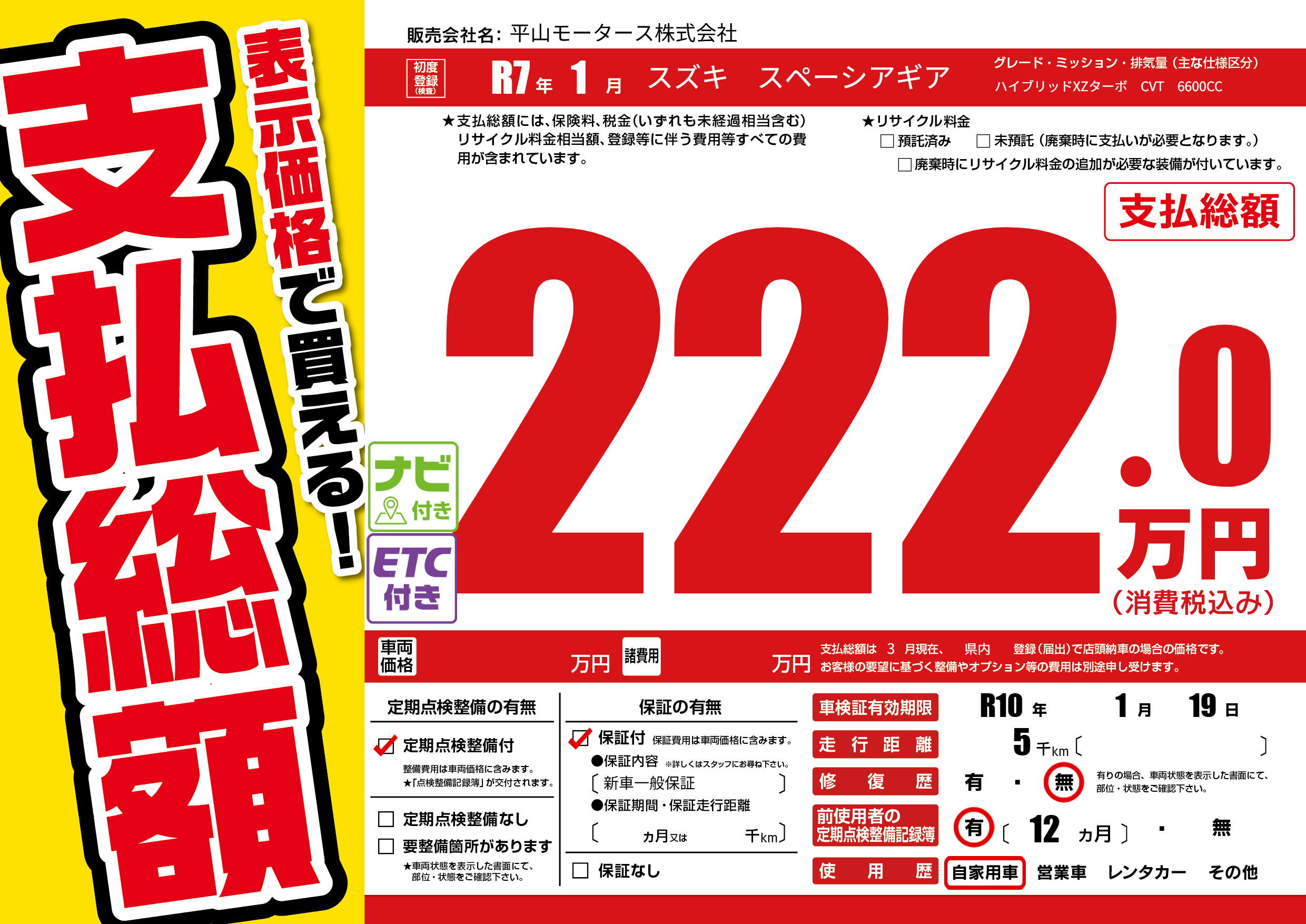 | 車検制限 | R10年 1月 19日 | ||