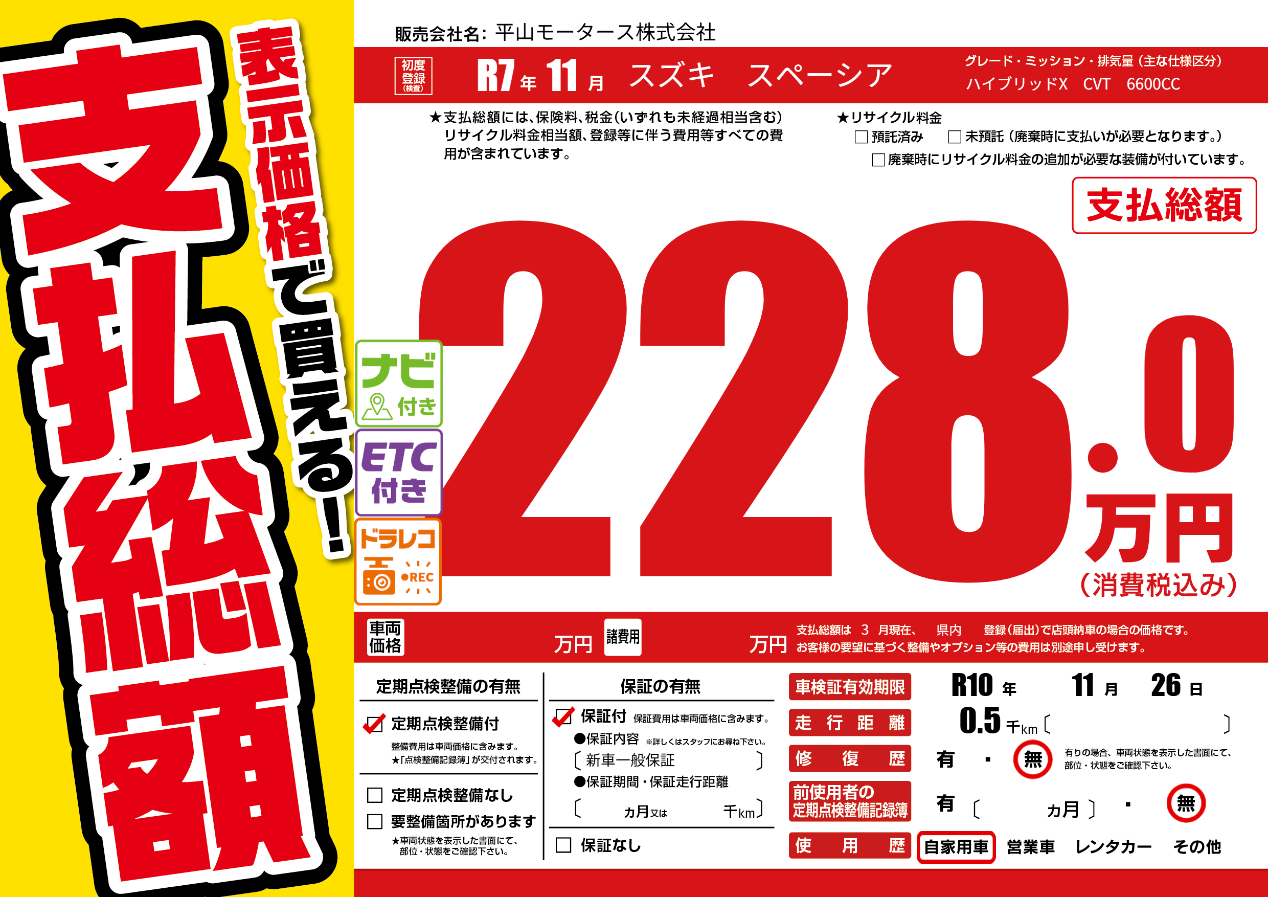 | 走行キロ | - | 初年度登録 | R7年11月 |
