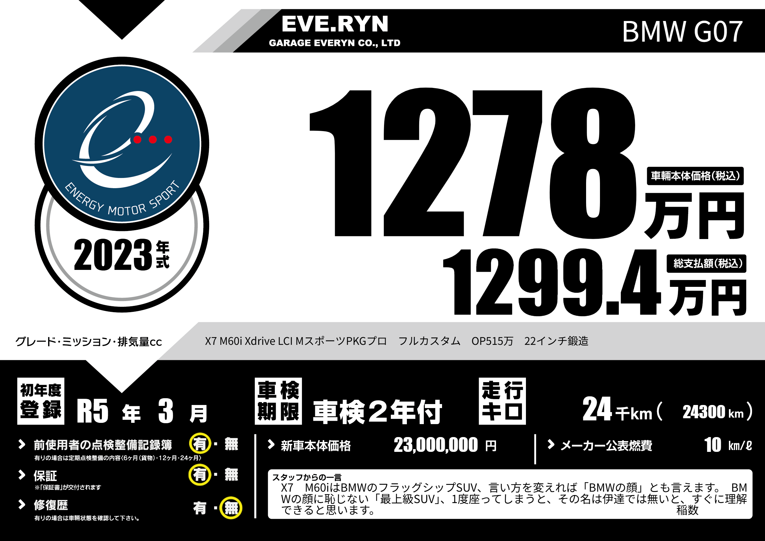 X7 M60i Xdrive LCI MスポーツPKGプロ フルカスタム OP515万 22インチ鍛造 |