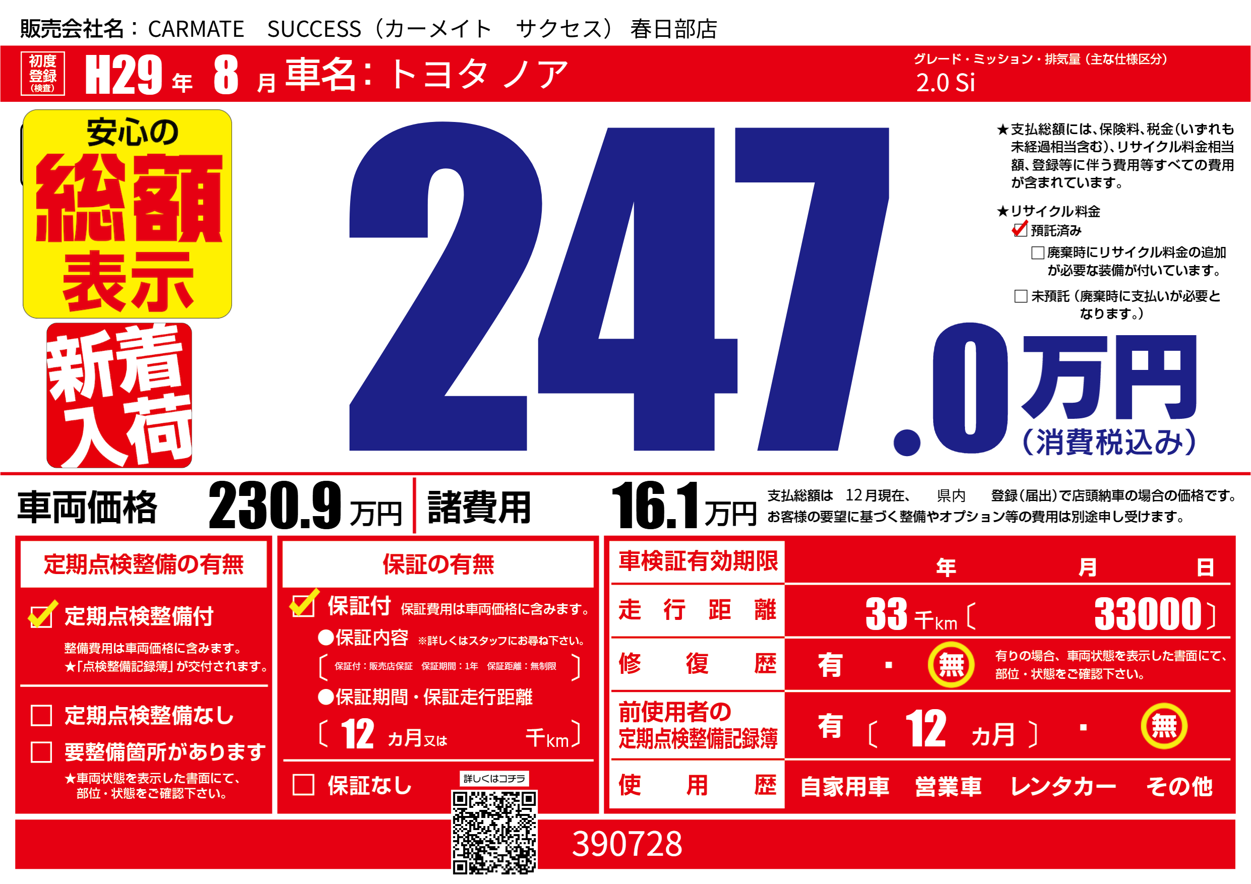 保証内容(保証付:販売店保証 保証期間:1年 保証距離:無制限) 12ヶ月または千km