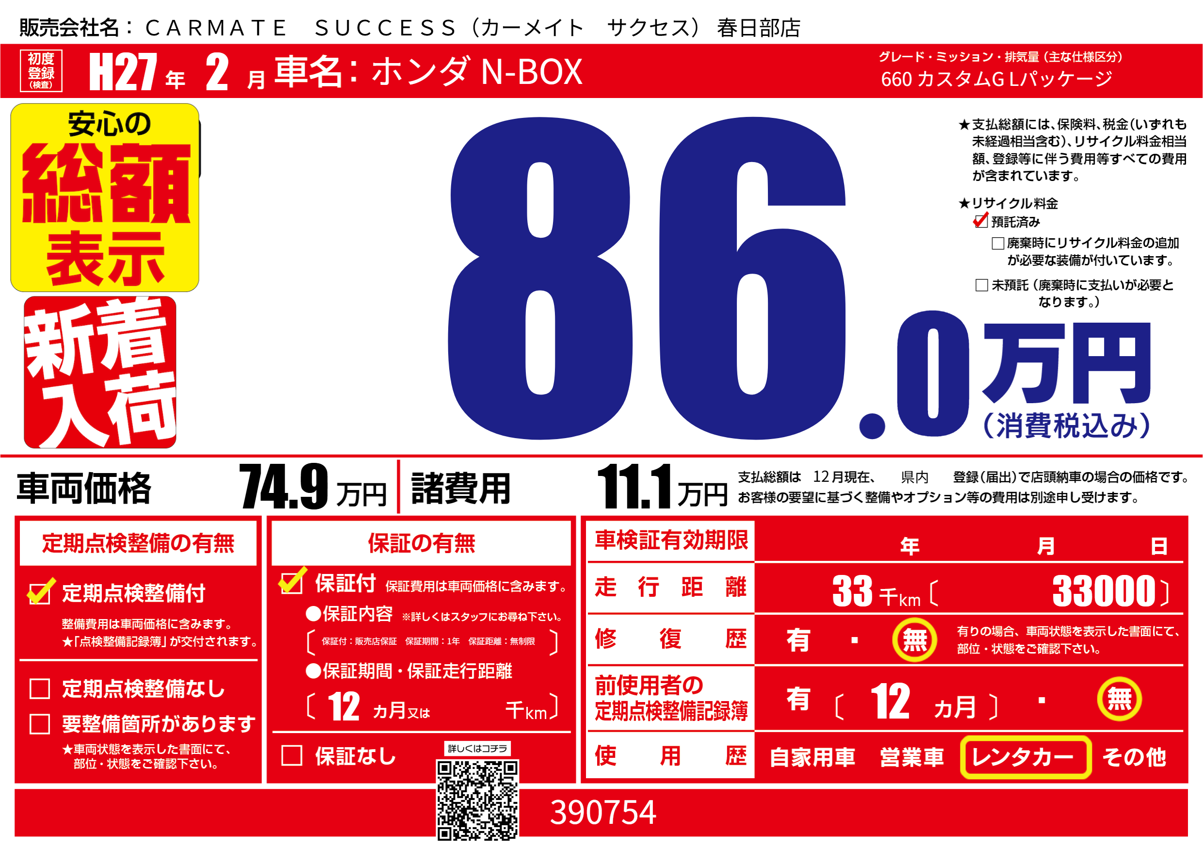 保証なし 保証内容(保証付:販売店保証 保証期間:1年 保証距離:無制限) 12ヶ月または()千kmまで |