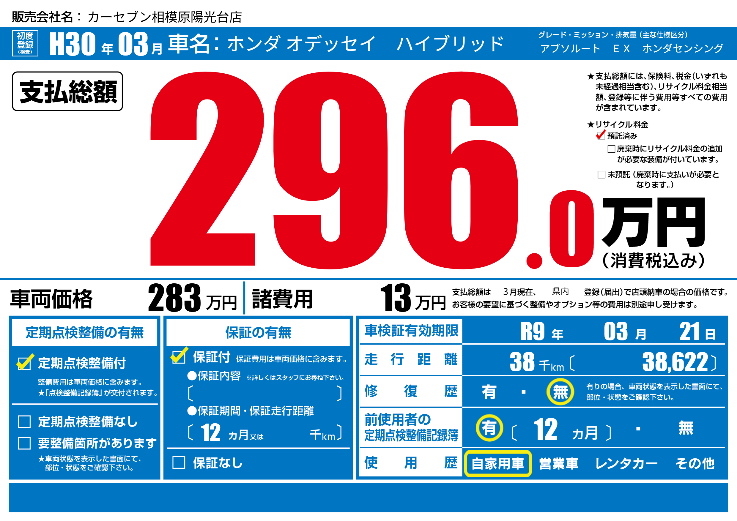 | 車名 | ホンダ オデッセイ ハイブリッド | グレード ミッション 排気量 |
