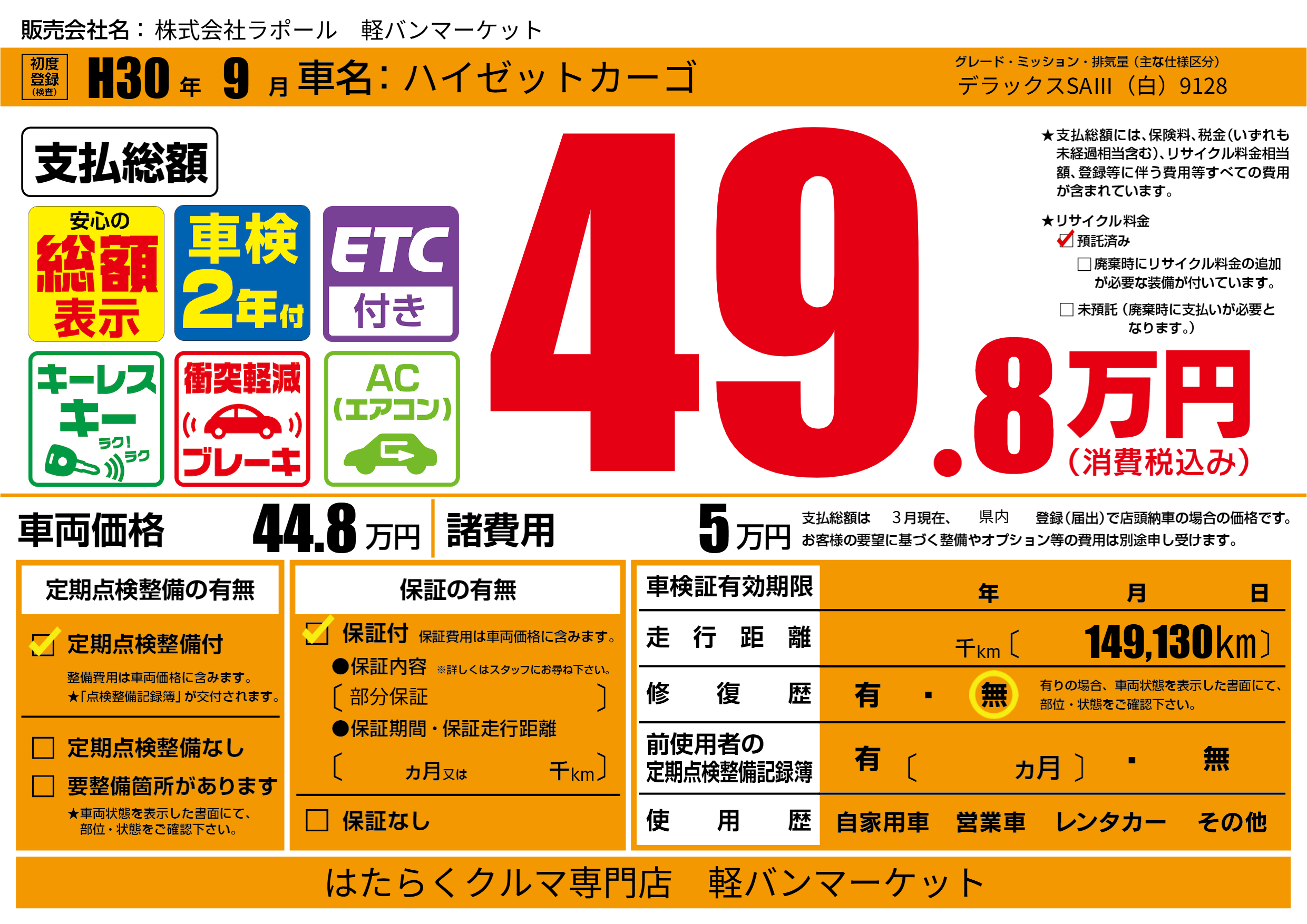 | 車名 | ハイゼットカーゴ | グレード ミッション 排気量 |