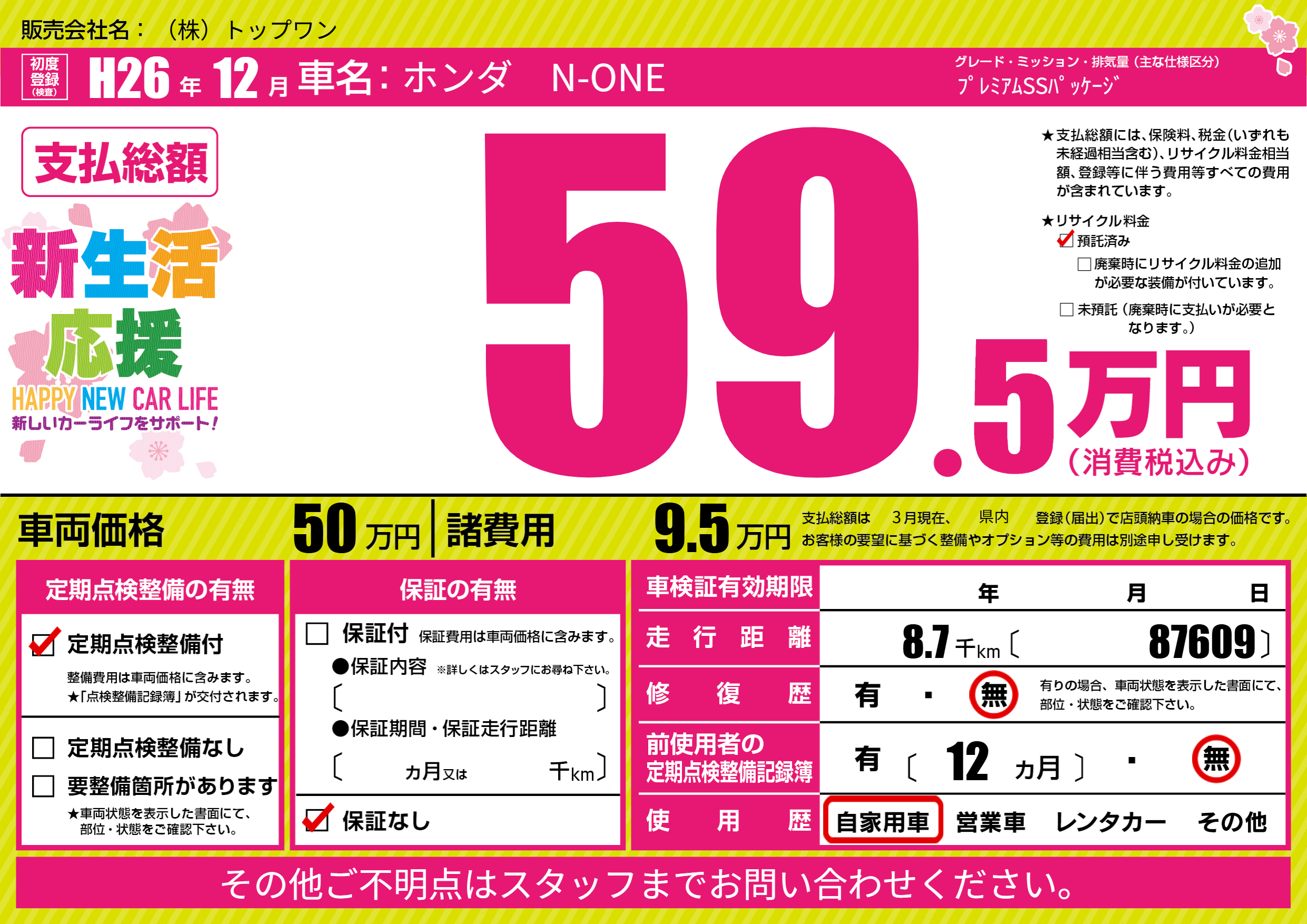 | 車名 | ホンダ N-ONE | グレード ミッション 排気量 |