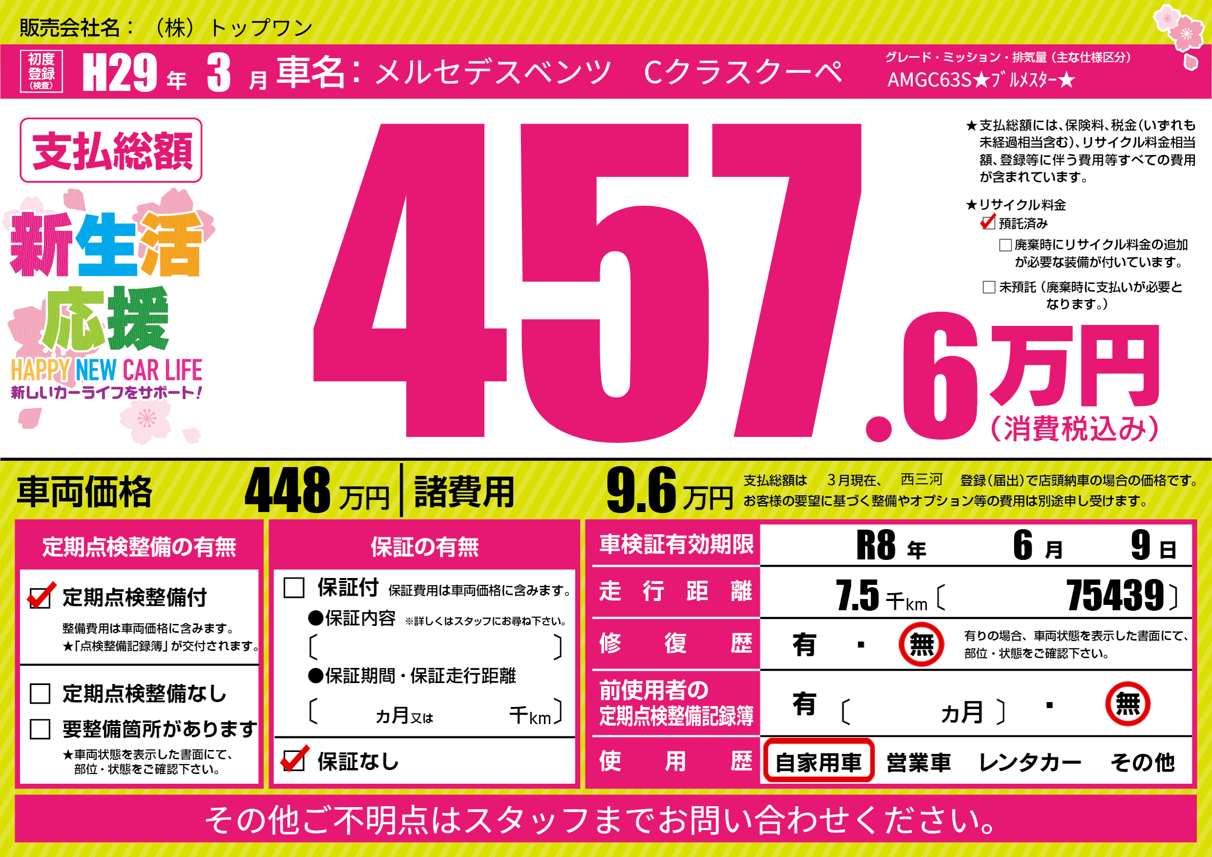 | 車名 | メルセデスベンツ Cクラスクーペ | グレード ミッション 排気量 |