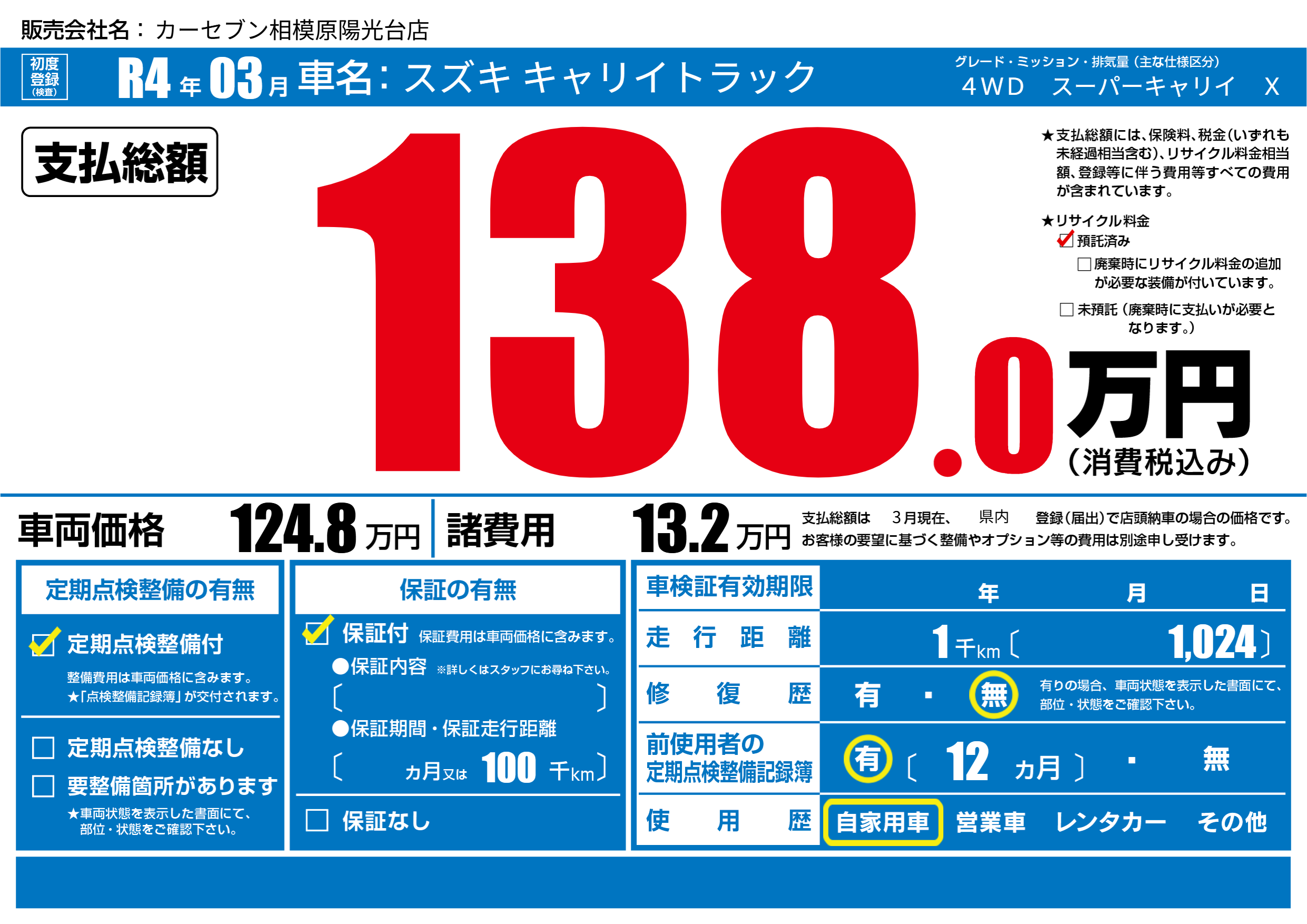 保証付き 保証内容(---) ---ヶ月または(100)千kmまで |