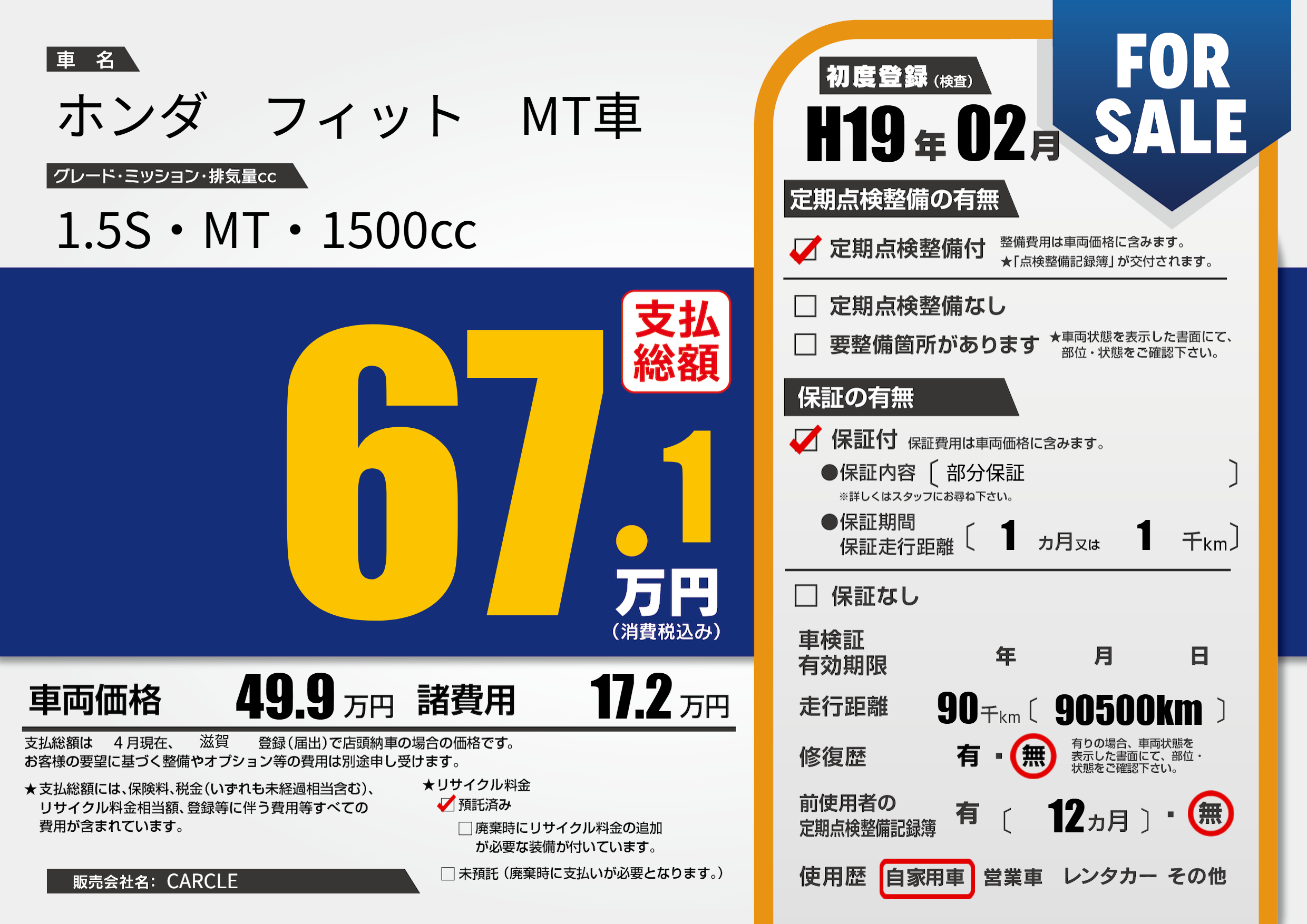 | 車名 | ホンダ フィット MT車 | グレード ミッション 排気量 |