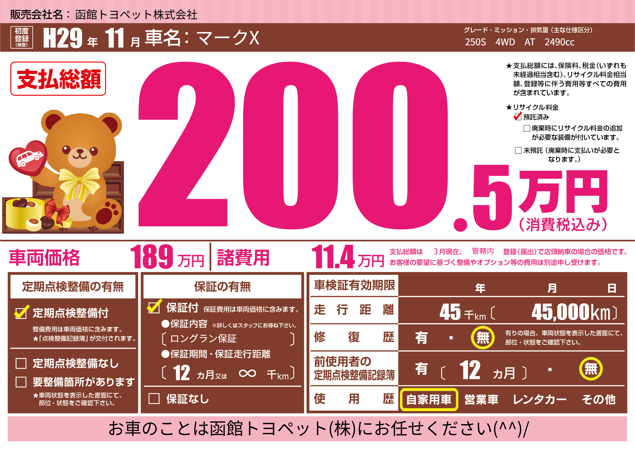 | 走行キロ | 4.5万km | 初年度登録 | H29年11月 |