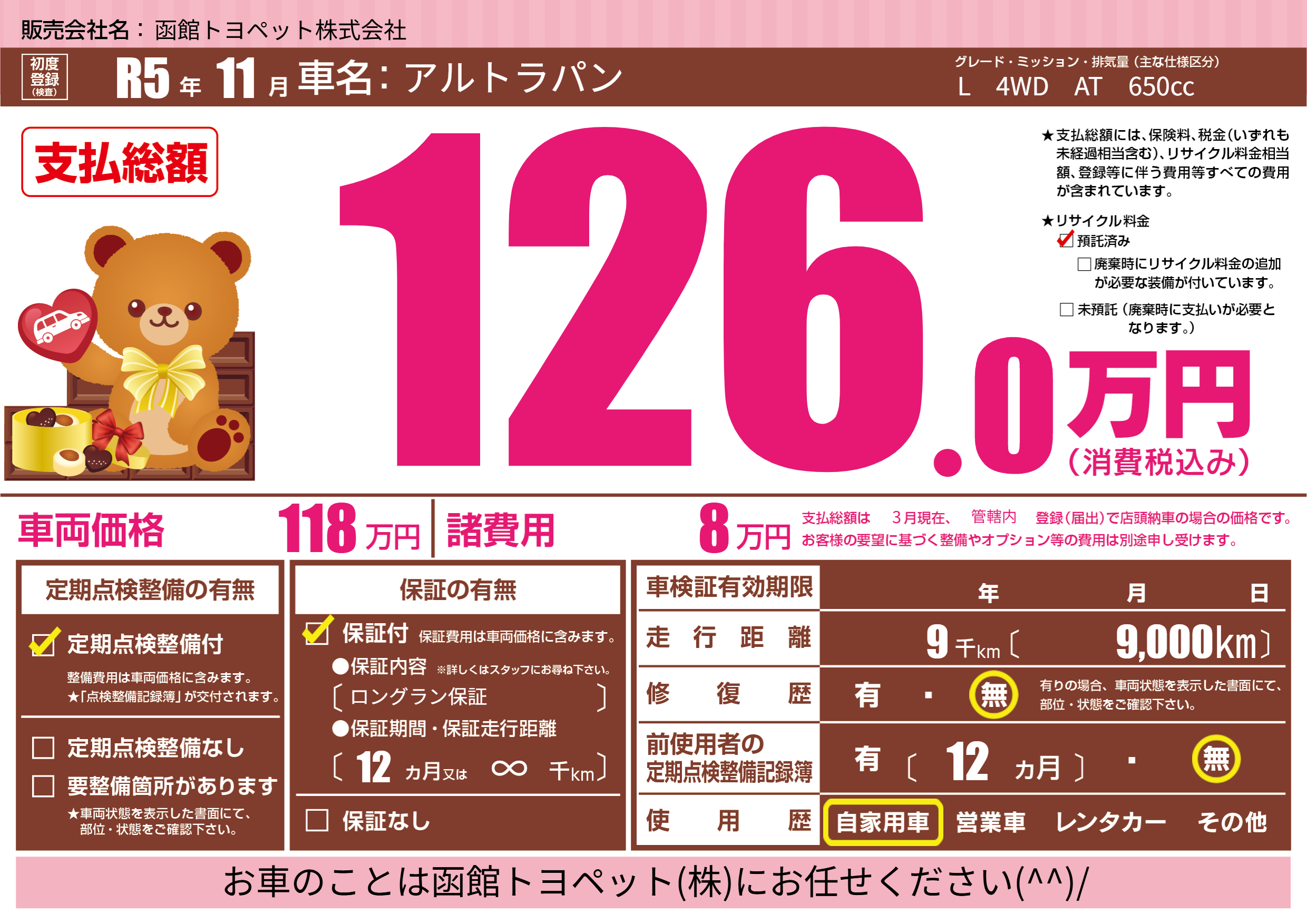 保証付き 保証内容(ロングラン保証) 12ヶ月または(∞)千kmまで |