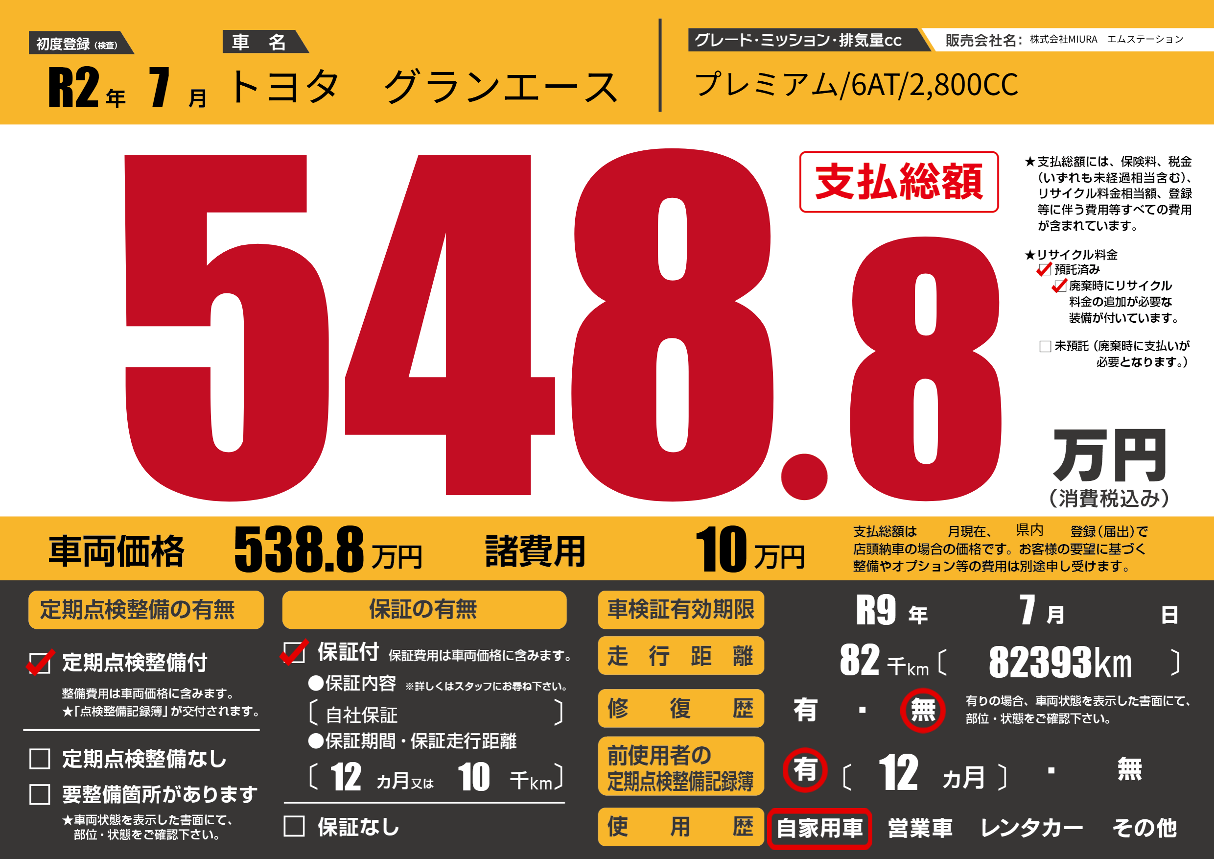 | 車名 | トヨタ グランエース | グレード ミッション 排気量 |