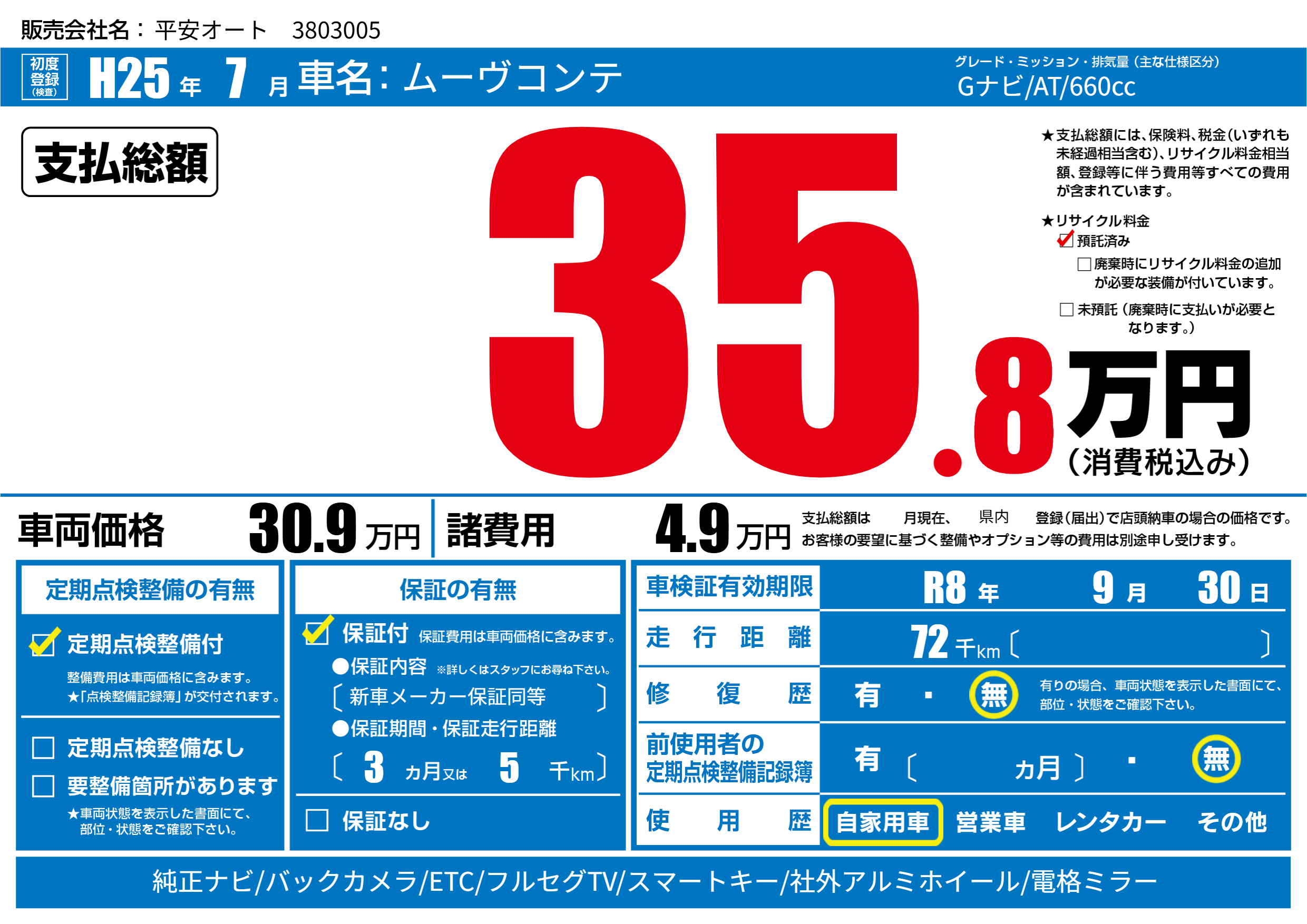 なし | 車検制限 | R8年9月30月 |