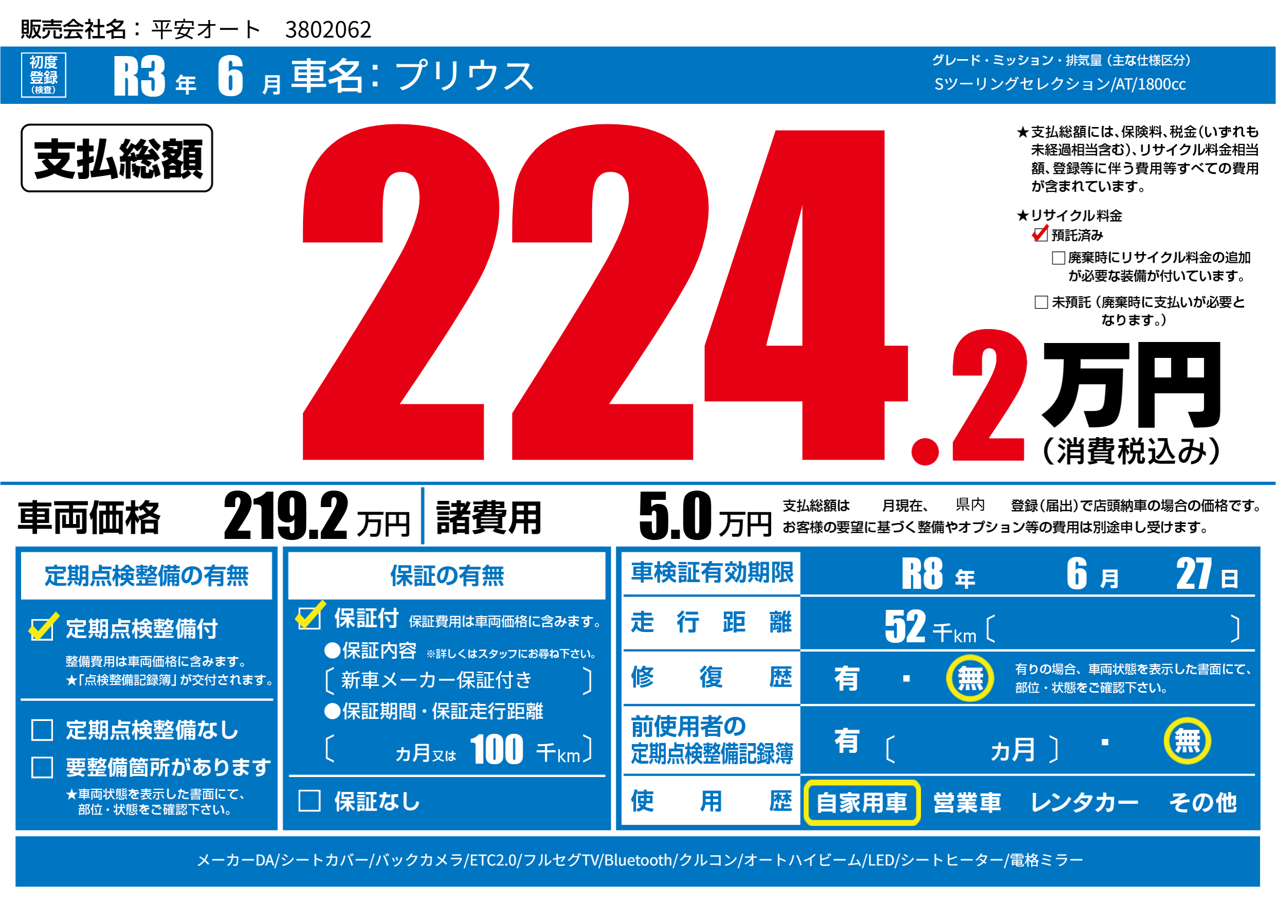 | 車検制限 | R8年 6月 27日 | ||