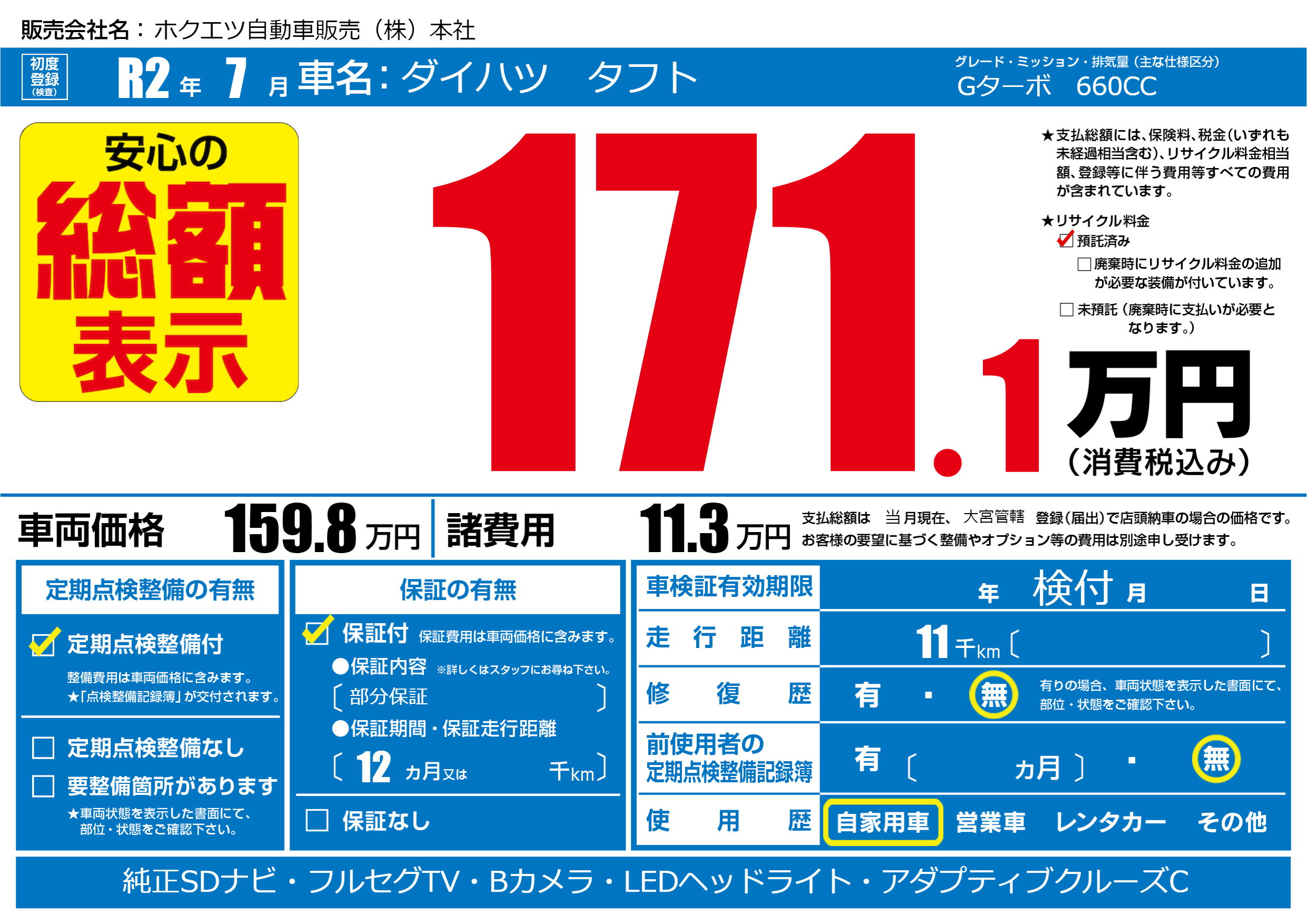 | 走行キロ | 1.1万km | 初年度登録 | R2年7月 |