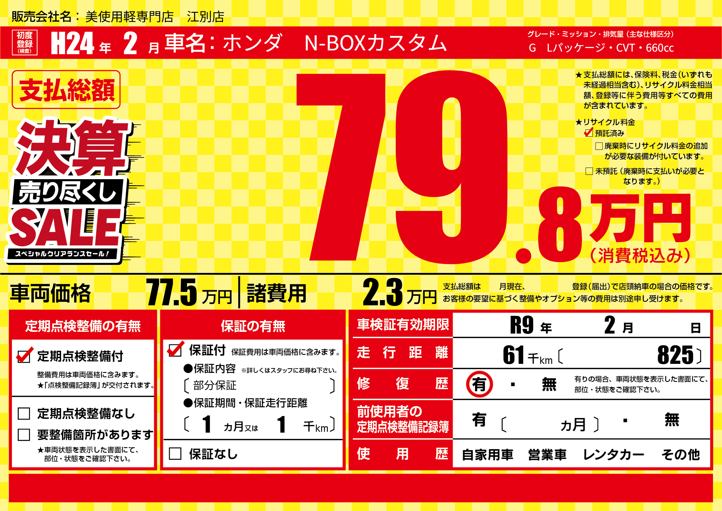 | 車検制限 | R9年 2月 - 日 | ||