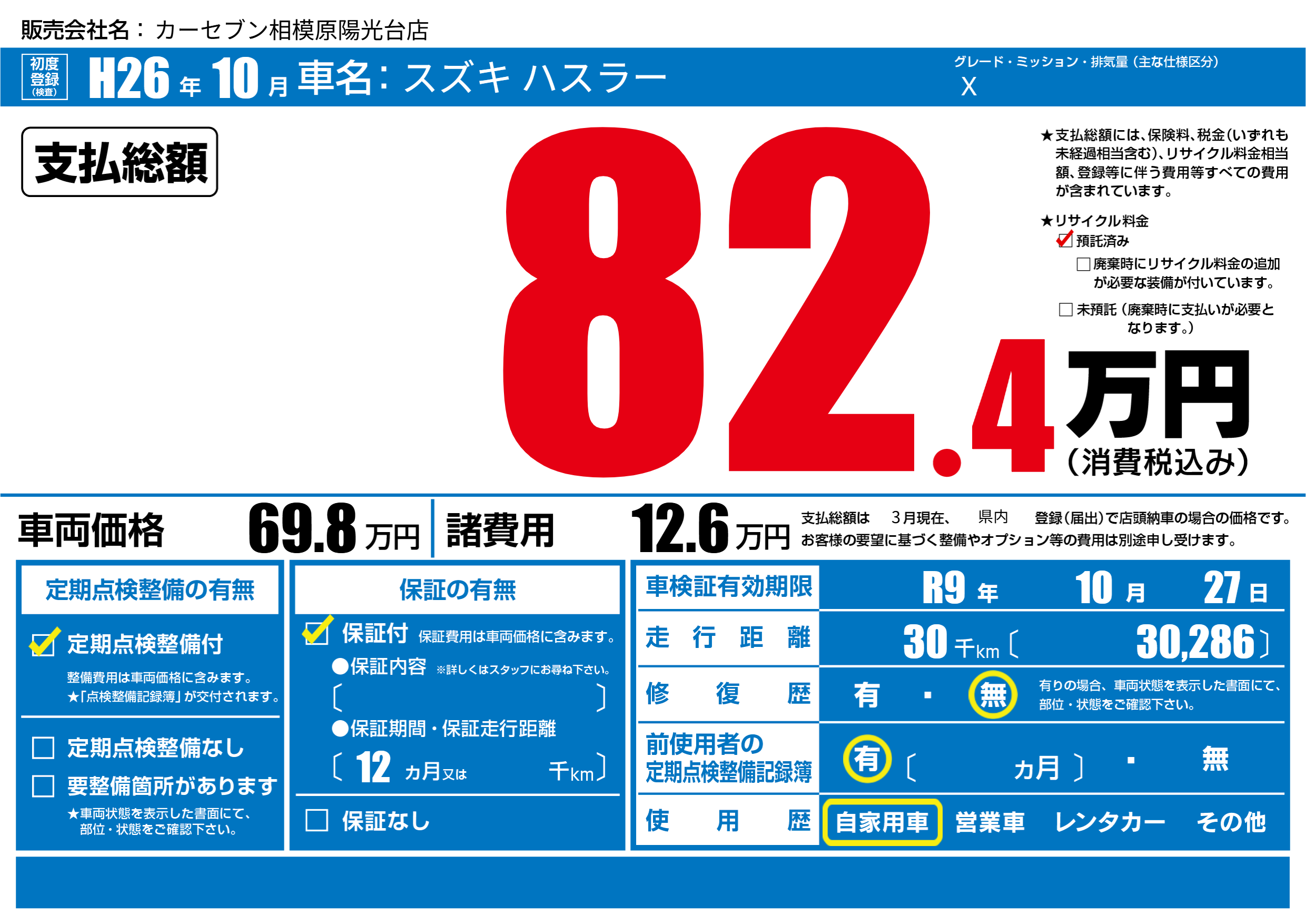 | 走行キロ | 3万km | 初年度登録 | H26年10月 |