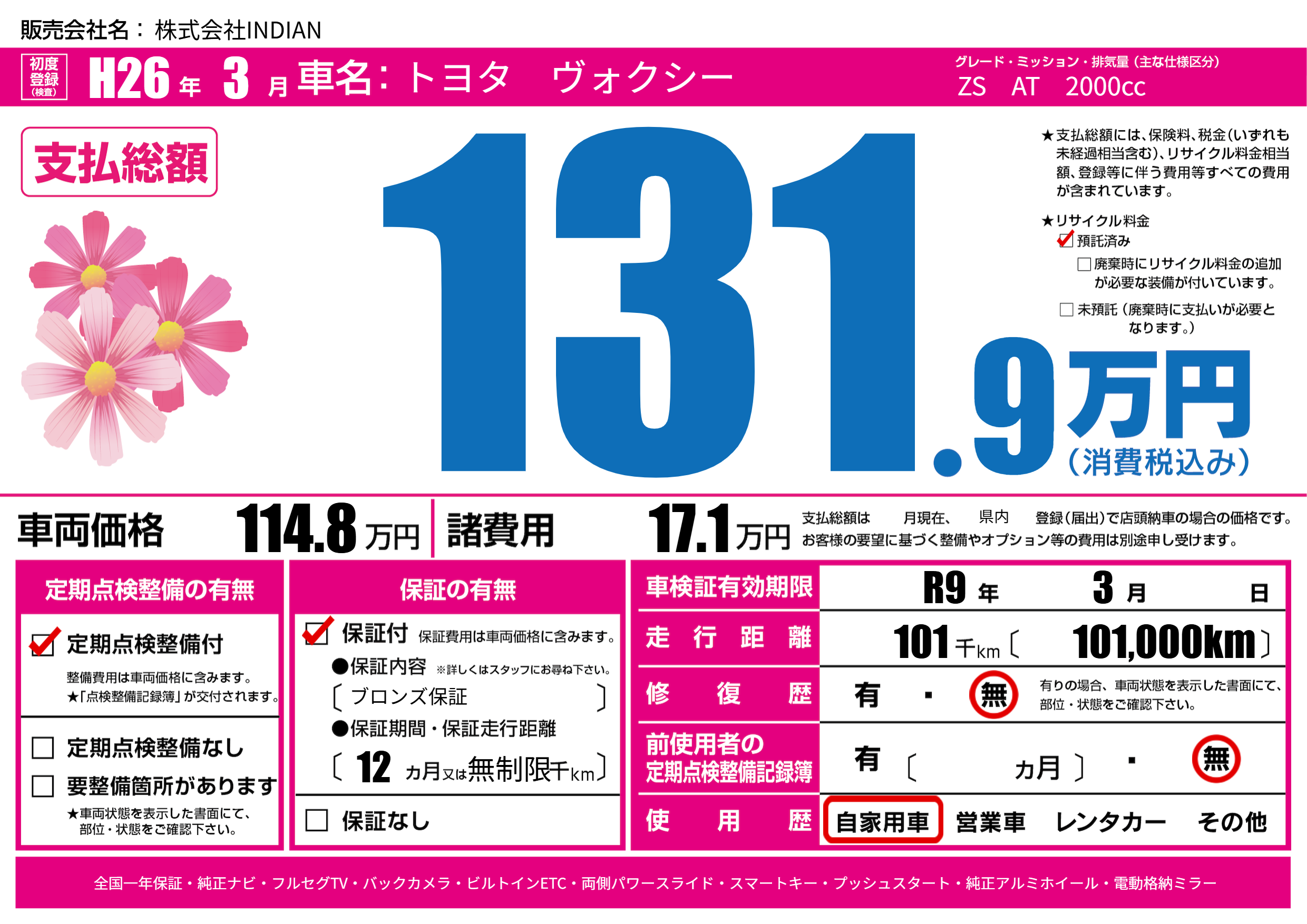| 車名 | トヨタ ヴォクシー | グレード ミッション 排気量 |