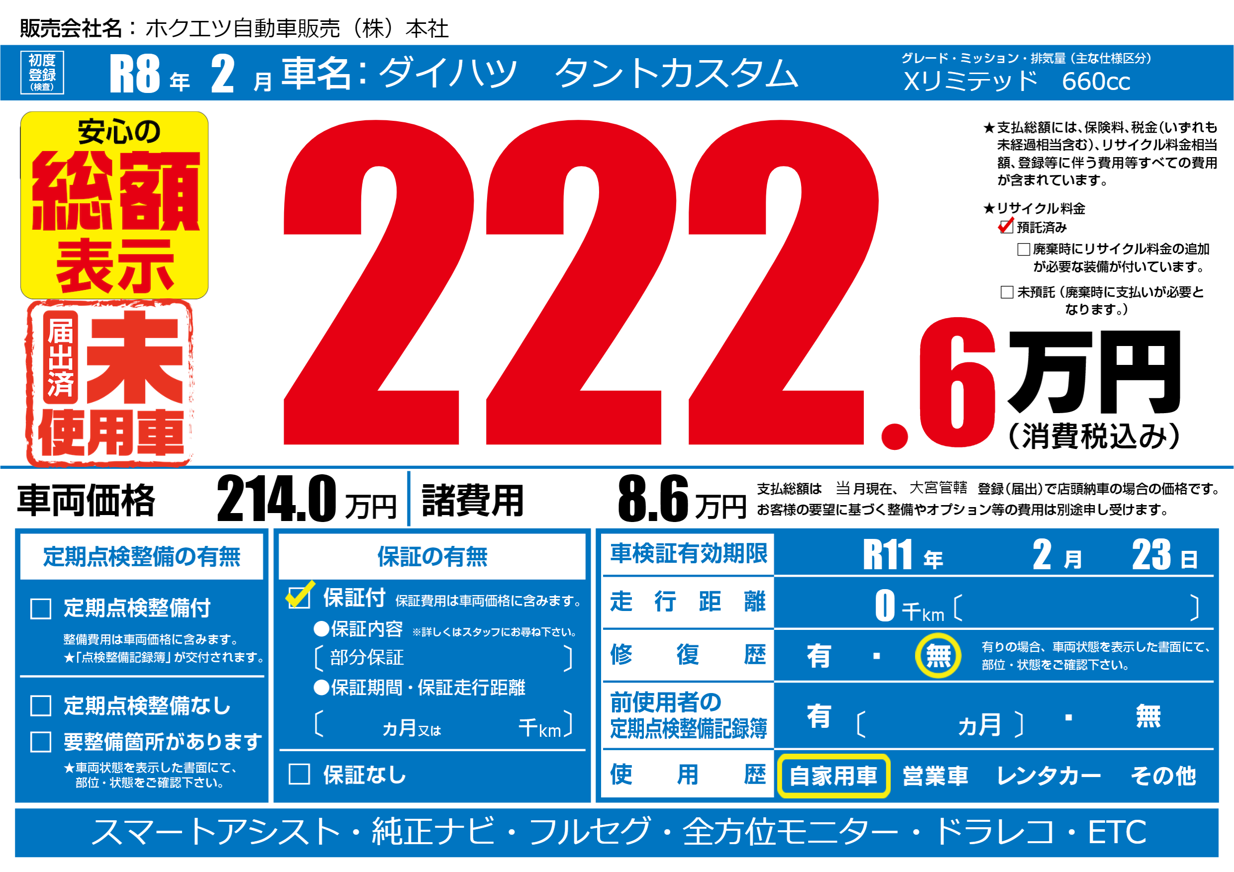 | 走行キロ | - | 初年度登録 | R8年2月 |