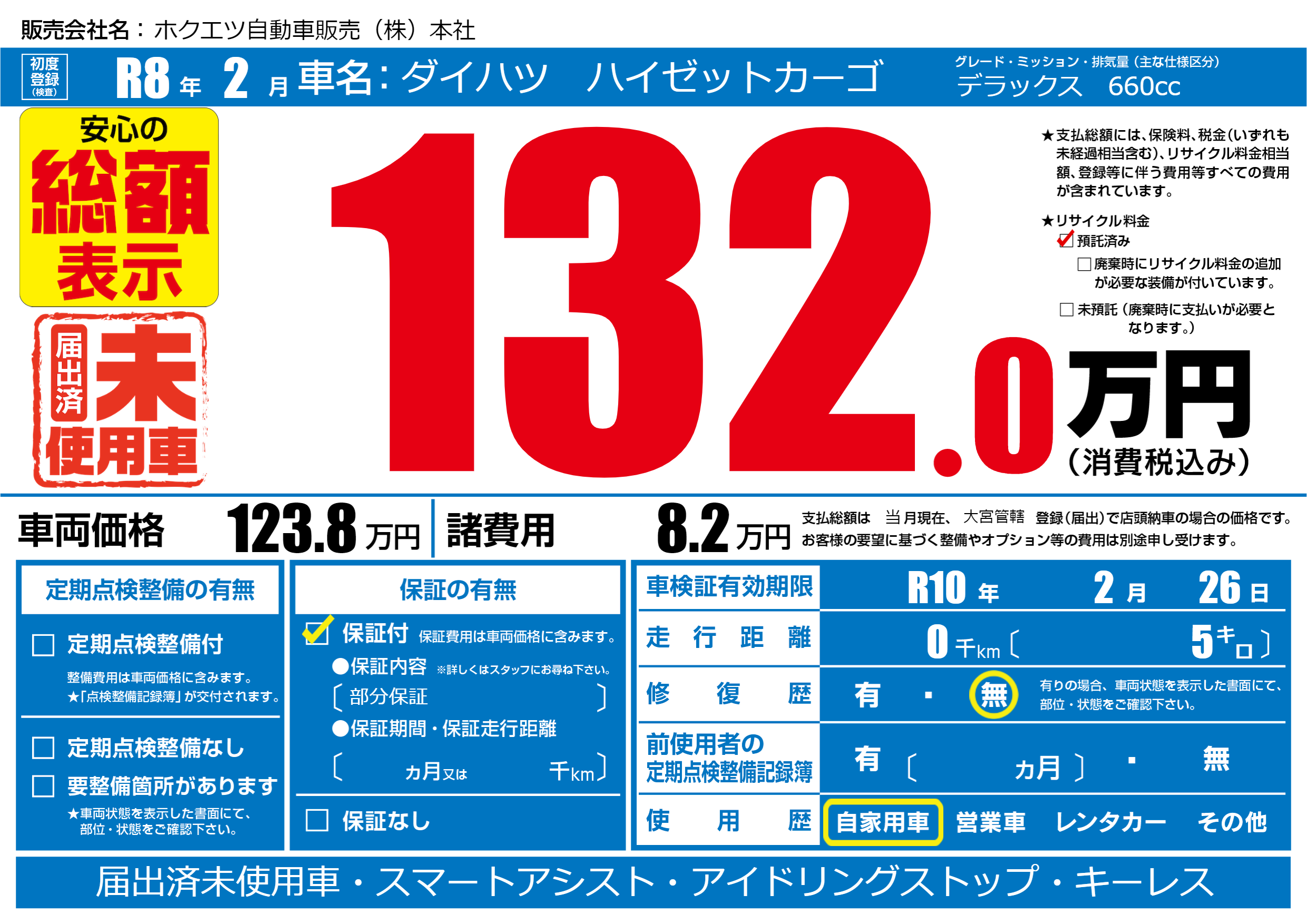 | 走行キロ | - | 初年度登録 | R8年2月 |