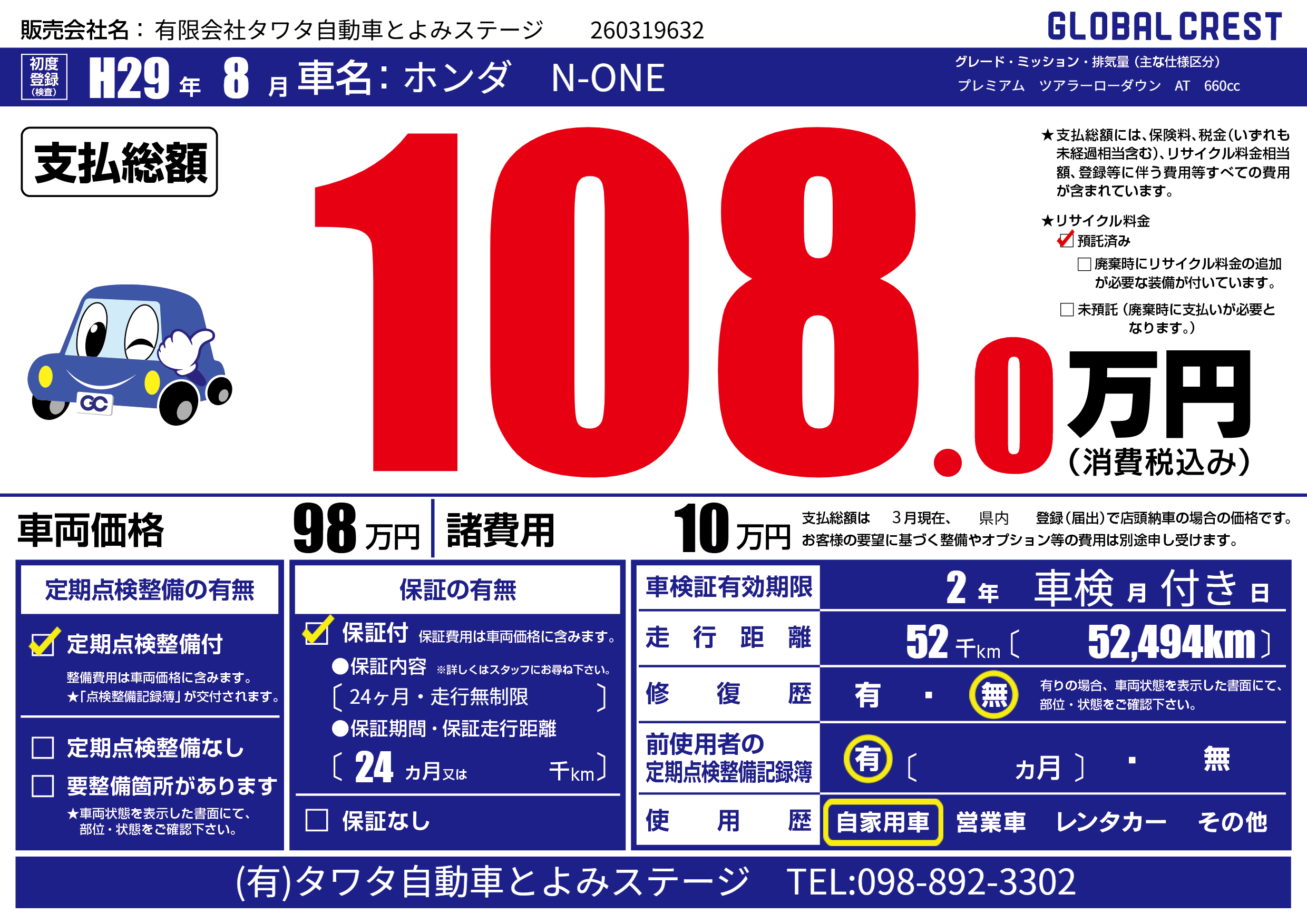 | 車名 | ホンダ N-ONE | グレード ミッション 排気量 |