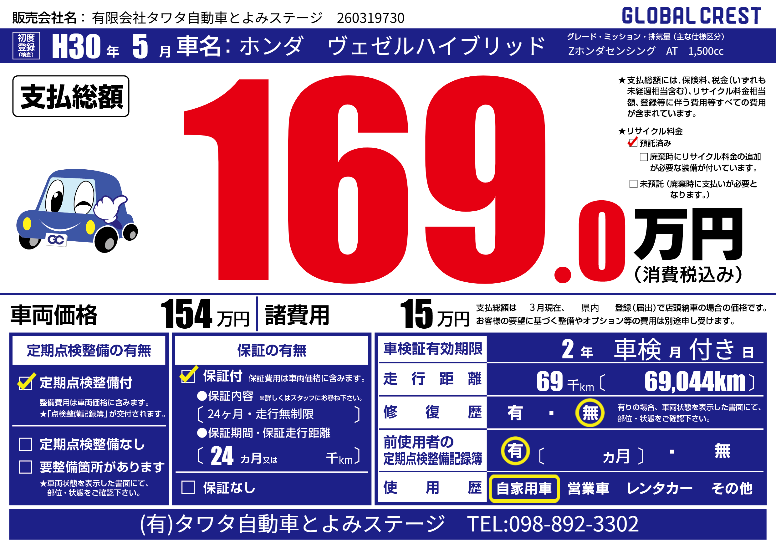 | 車名 | ホンダ ヴェゼルハイブリッド | グレード ミッション 排気量 |