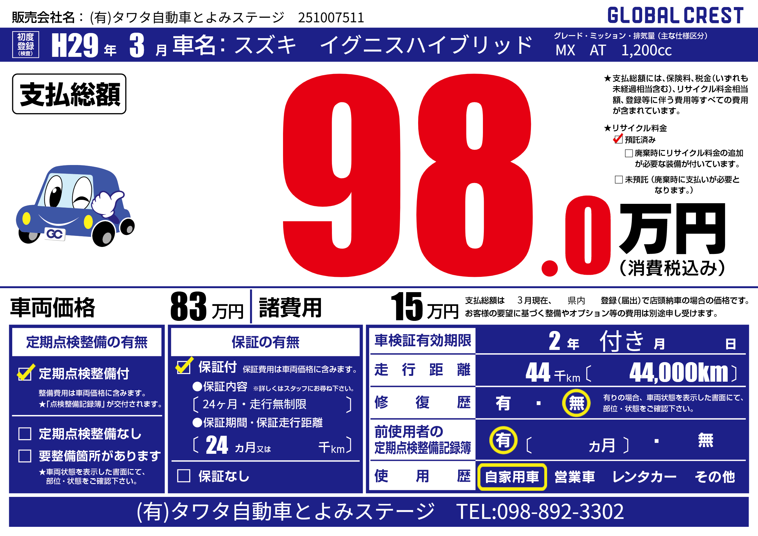 | 車名 | スズキ イグニスハイブリッド | グレード ミッション 排気量 |