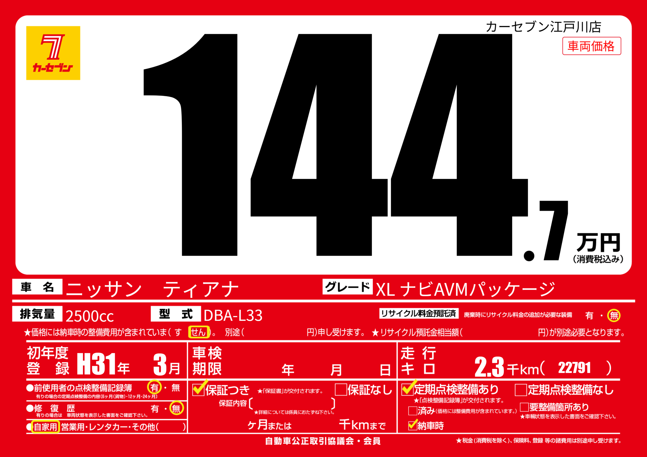 | 定期点検整備 | 定期点検整備あり 納車時あり | ||