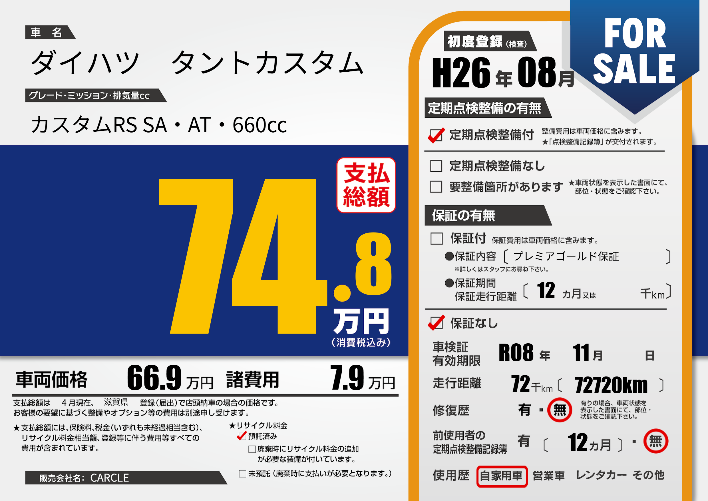 | 走行キロ | 7.2万km | 初年度登録 | H26年08月 |