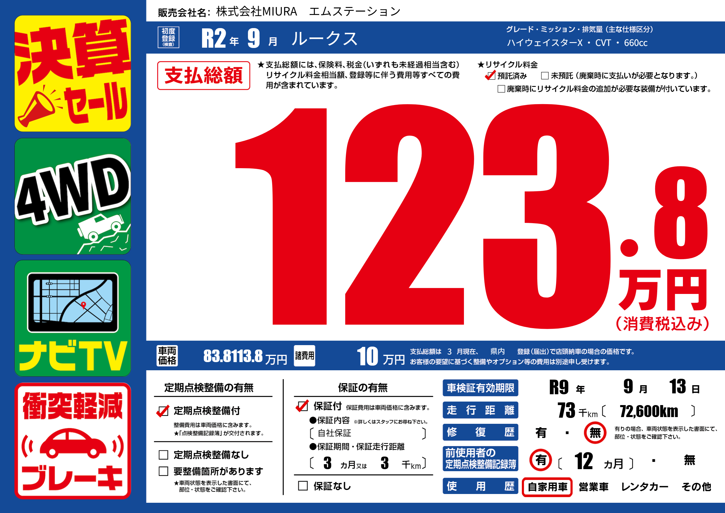 | 走行キロ | 7.3万km | 初年度登録 | R2年9月 |