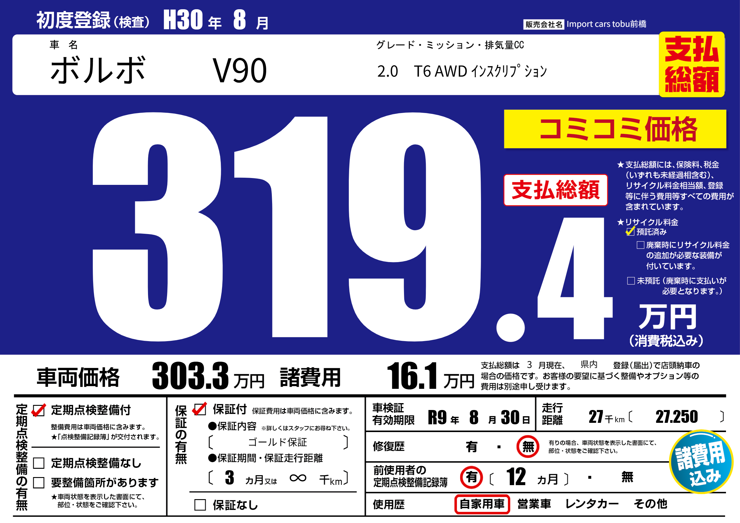 | 車名 | ボルボ V90 | グレード ミッション 排気量 |