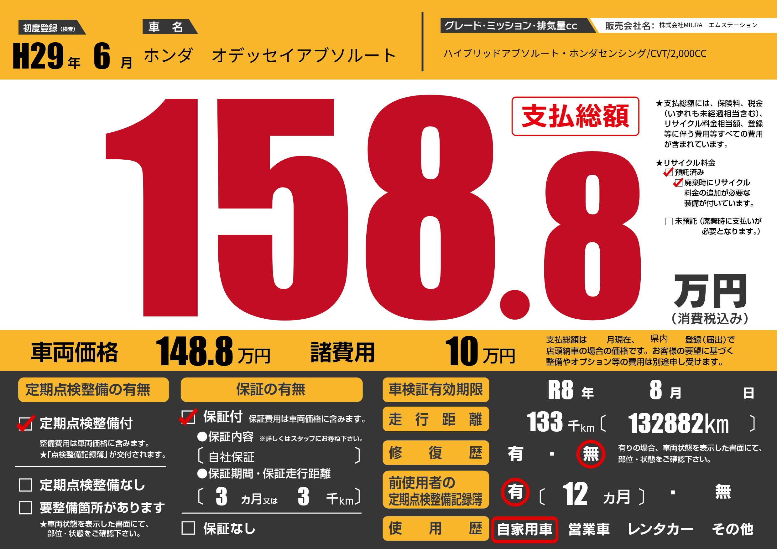 | 走行キロ | 13.3万km | 初年度登録 | H29年6月 |