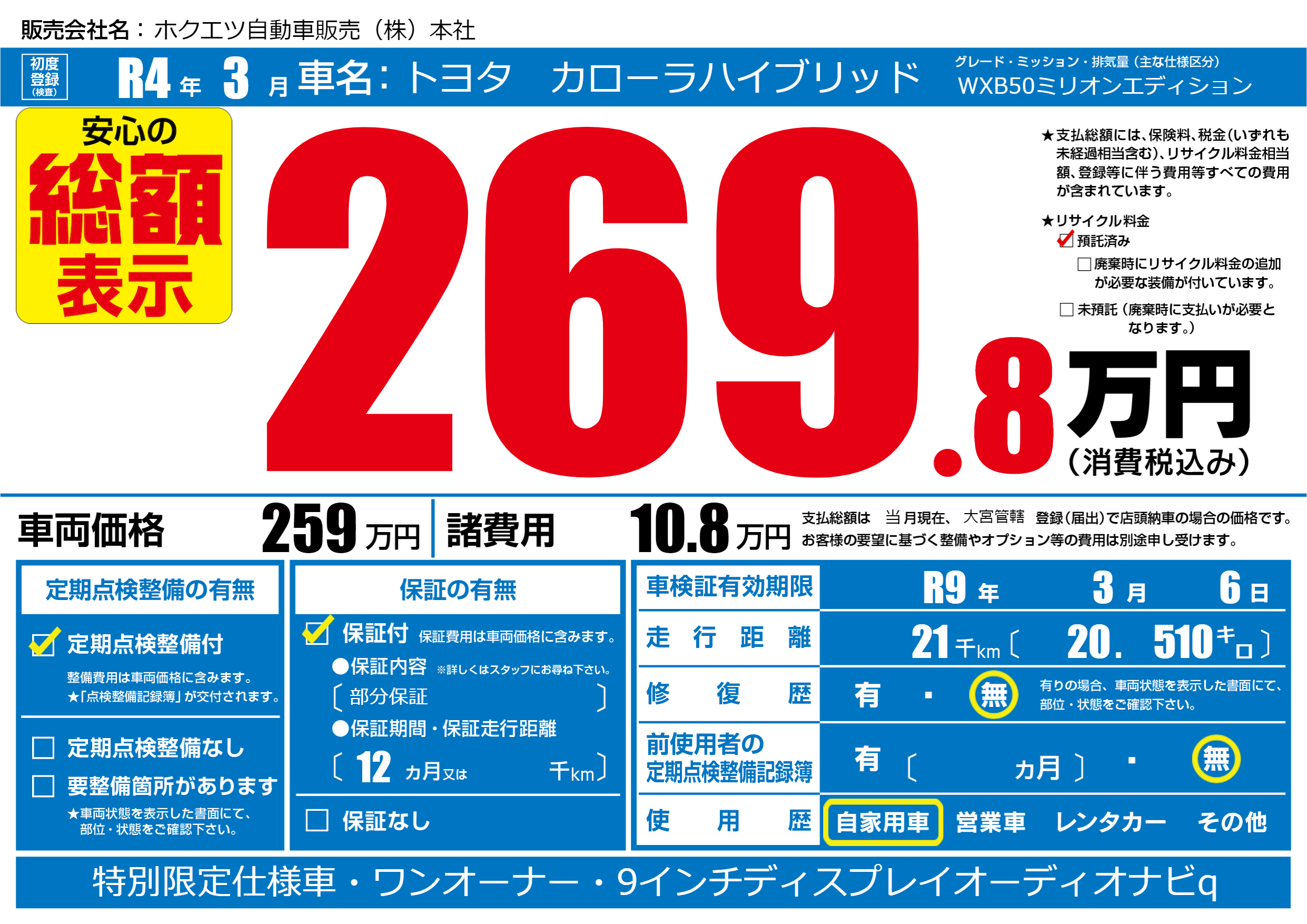 | 車名 | トヨタ カローラハイブリッド | グレード ミッション 排気量 |