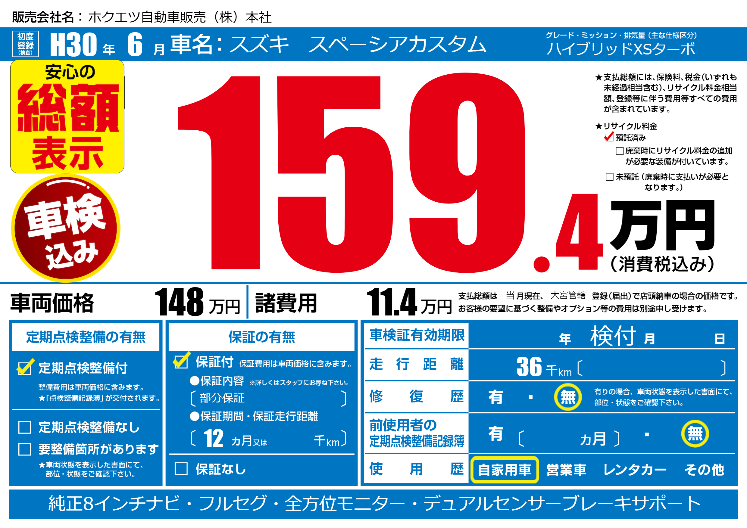 | 車名 | スズキ スペーシアカスタム | グレード ミッション 排気量 |