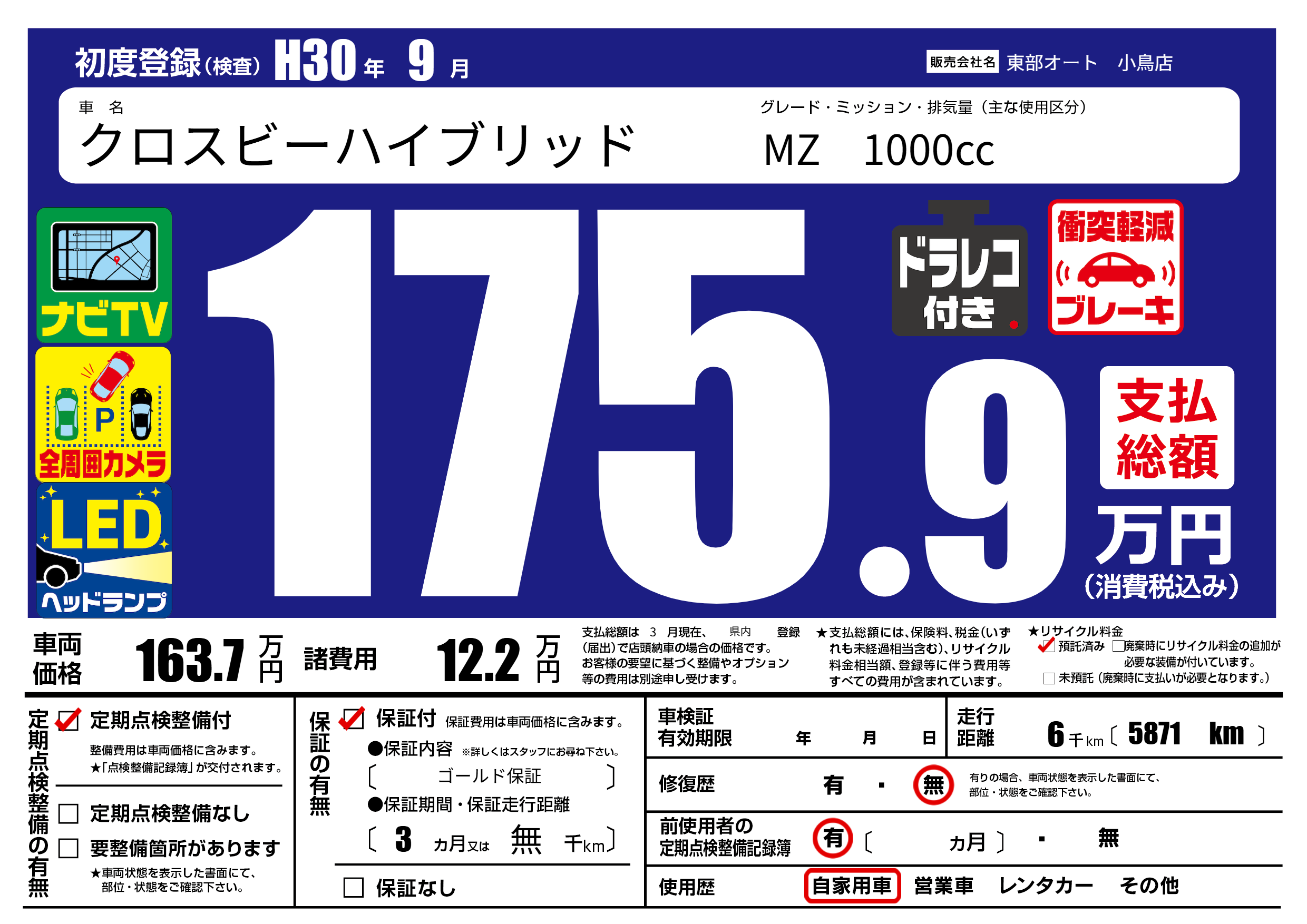 | 走行キロ | 0.6万km | 初年度登録 | H30年9月 |