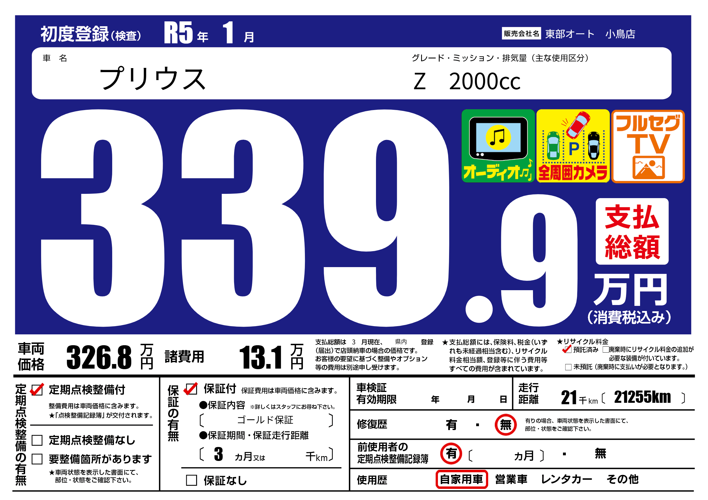 | 車名 | プリウス | グレード ミッション 排気量 |