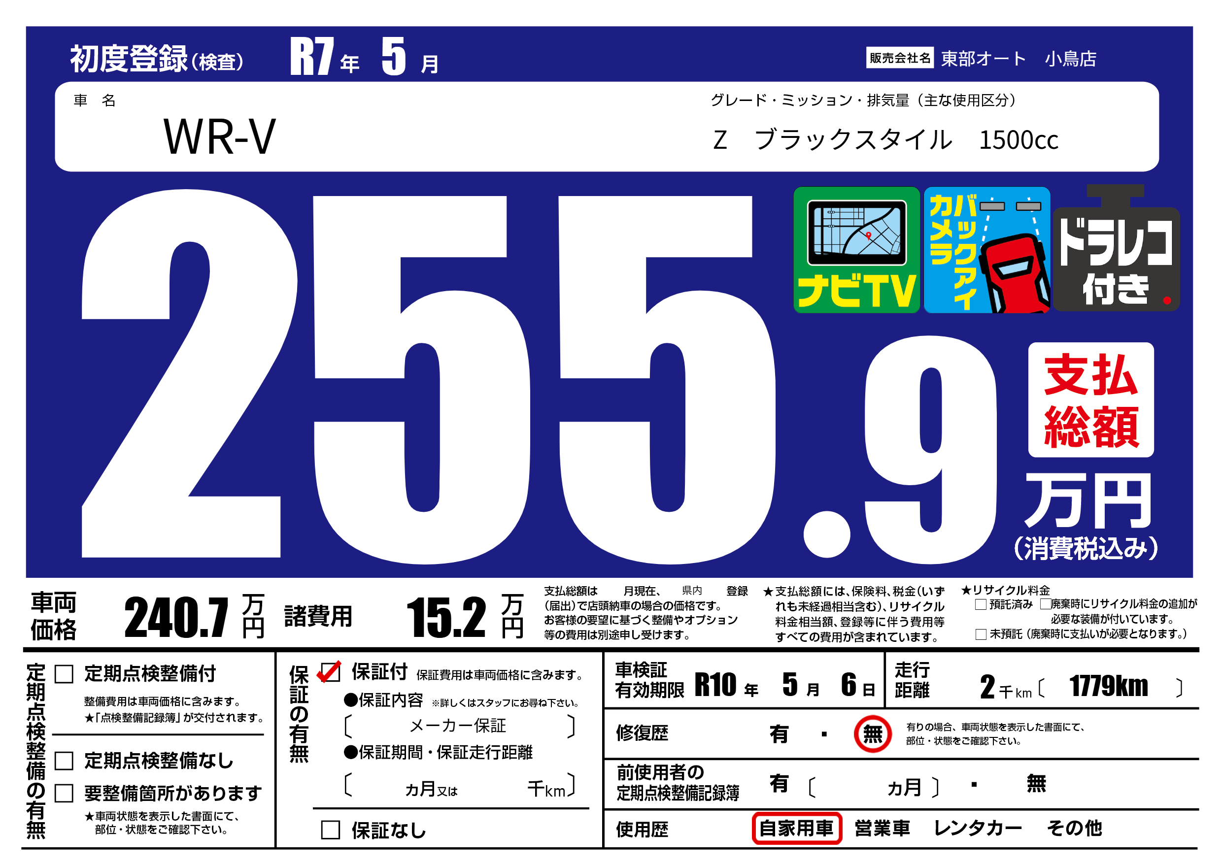 | 車名 | WR-V | グレード ミッション 排気量 |