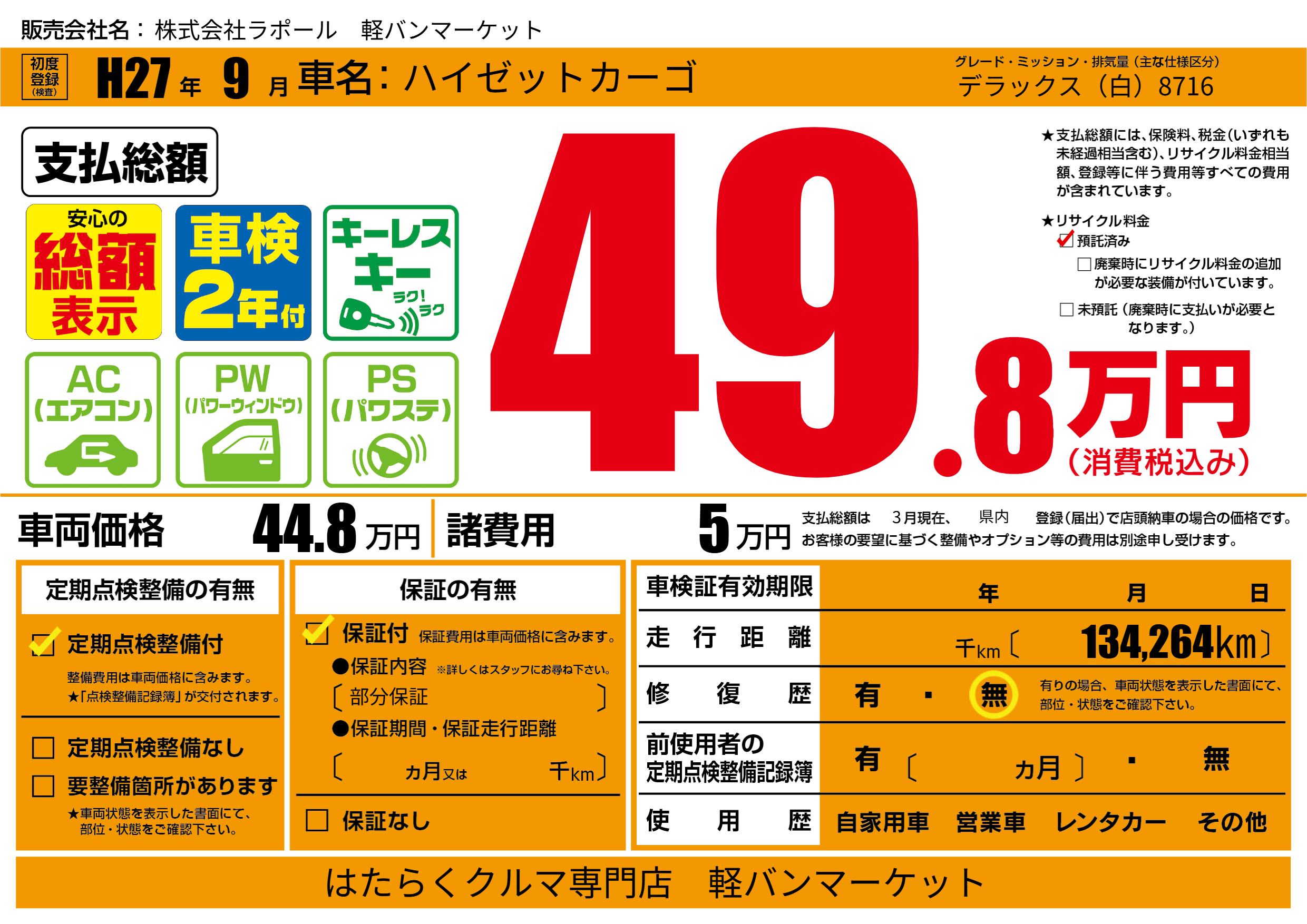 | 走行キロ | - | 初年度登録 | H27年9月 |