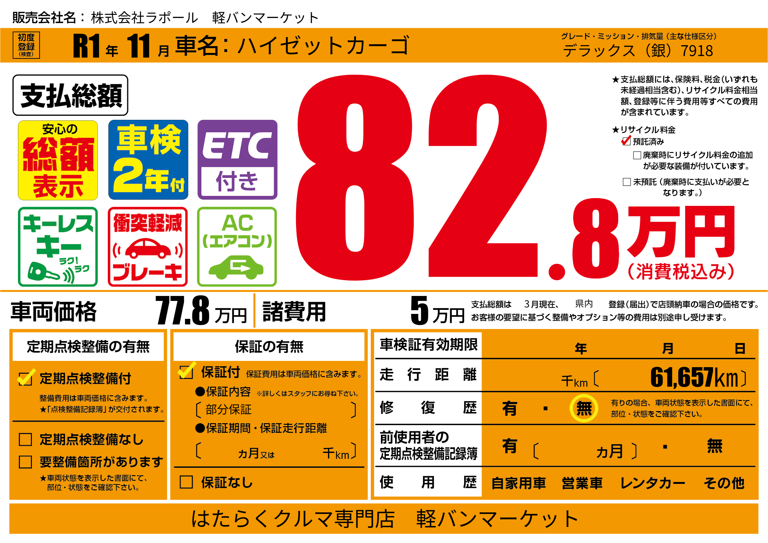 保証付き 保証内容(部分保証) ---ヶ月または()千kmまで |
