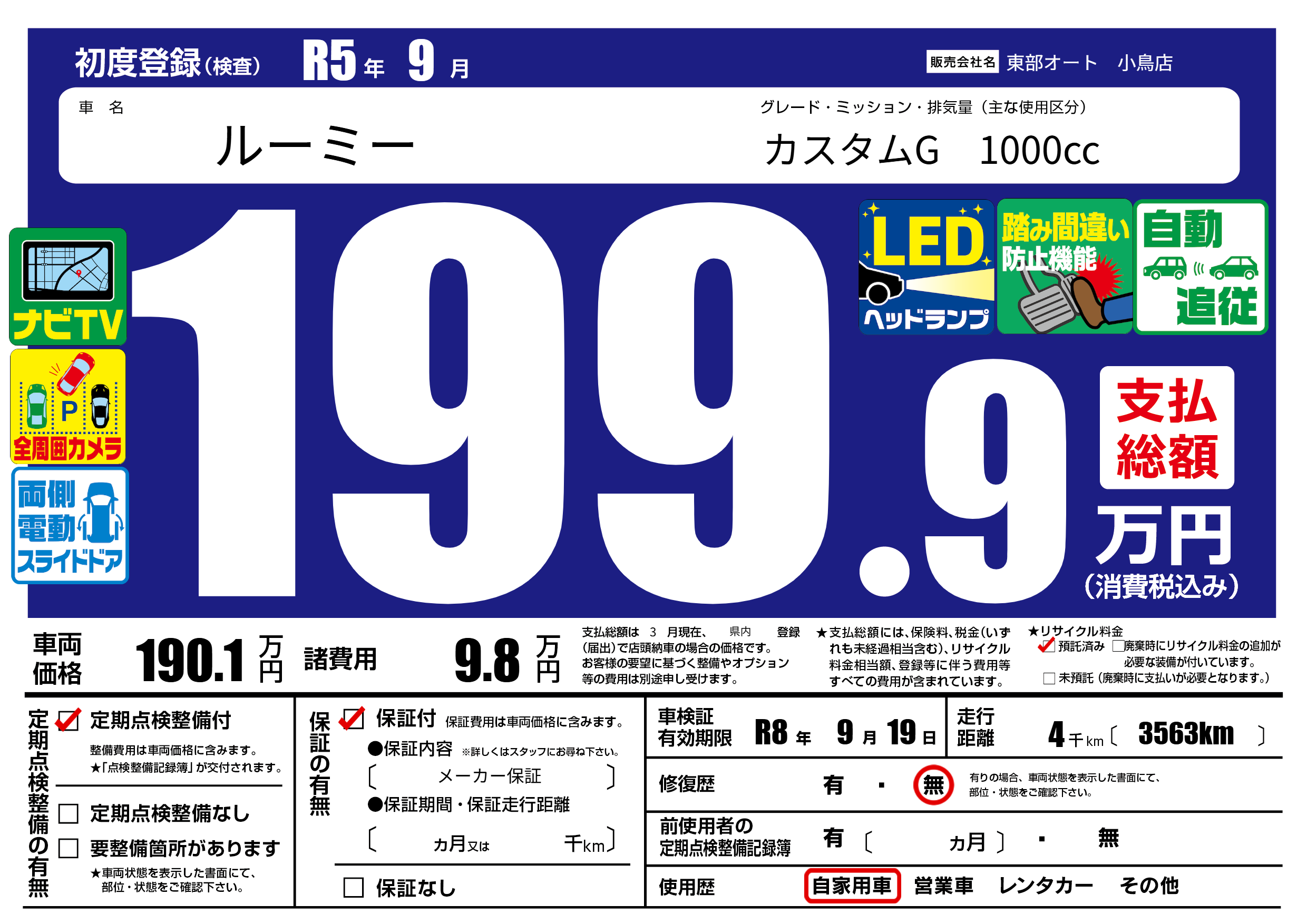 | 走行キロ | 0.4万km | 初年度登録 | R5年9月 |