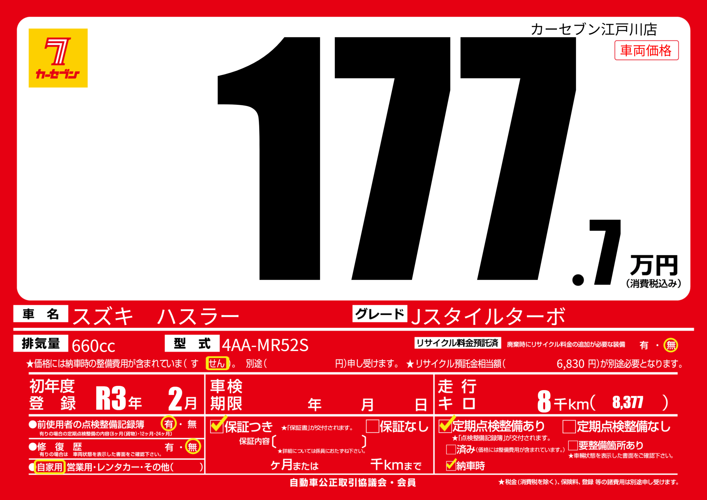 | 走行キロ | 0.8万km | 初年度登録 | R3年2月 |