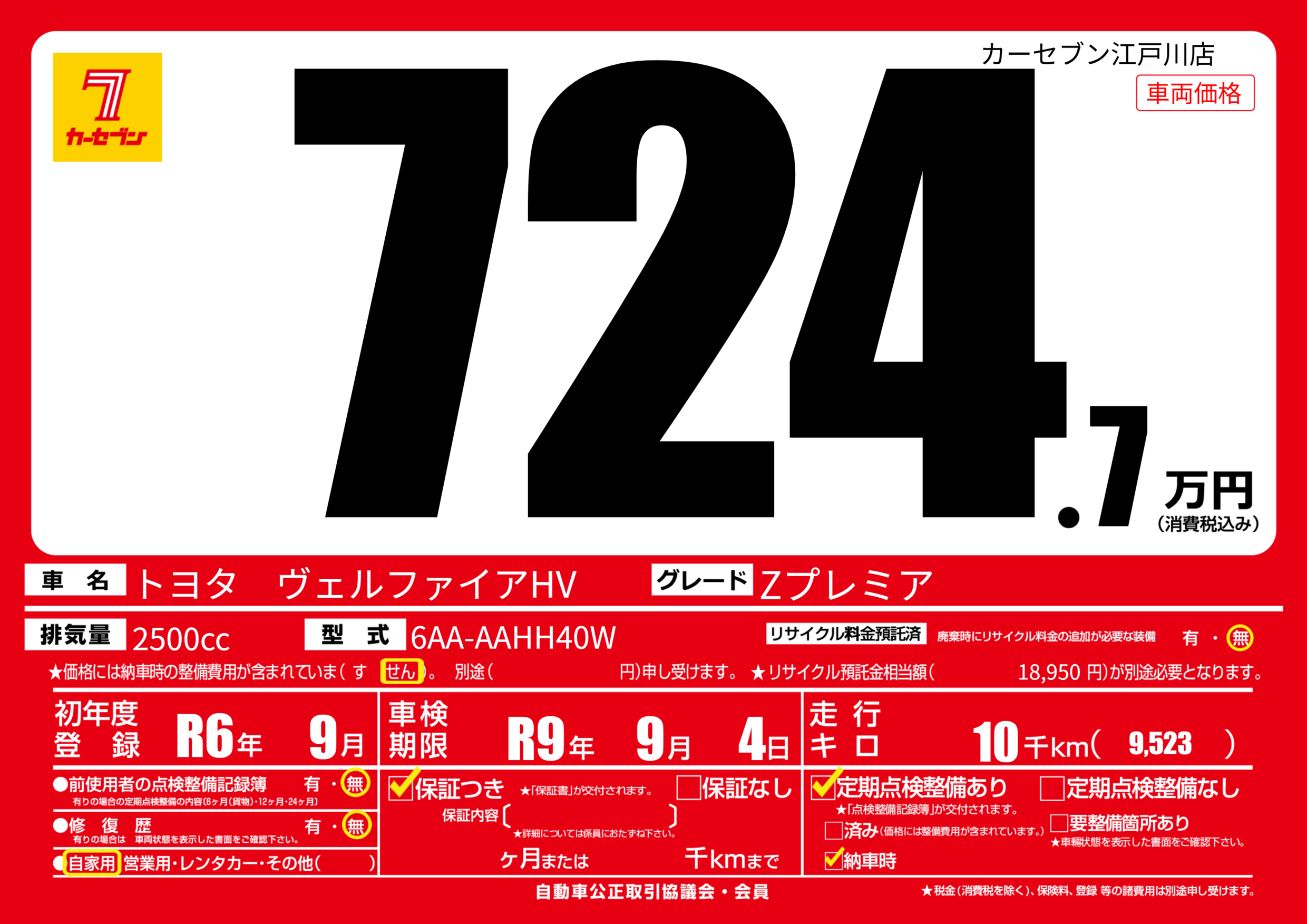 | 走行キロ | 1万km | 初年度登録 | R6年9月 |